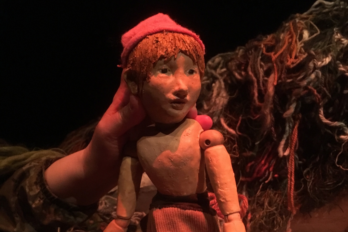 Nous entrons dans la salle et nous voici plongés dans un décor fantastique, sur scène se trouve une structure recouverte également de laine, nimbée de couleurs douces qui évoque une île recouverte d’algues dans laquelle vivent les vers qui donnent leur nom au titre du spectacle. Ces vers y creusent des galeries la façonnent tout comme nos souvenirs nous façonnent. Ce sont des figures tantôt douces et collantes tantôt effrayantes, ils accompagnent les aventures de Nanouk (qui ne sait pas quoi faire de ces animaux si étranges et si présents.) et de sa grand-mère. Les manipulatrices dans leur tenues recouvertes entièrement de laine telles des algues se fondent dans la structure de l’île elles deviennent vagues rapportant sur l’île les personnages passant ainsi de scène en scène.