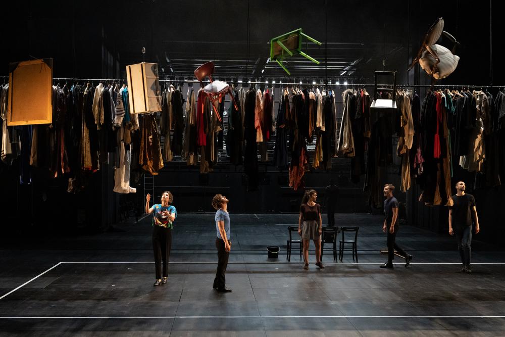 Après un lever de rideau lent et presque solennel, accompagné d’un silence idoine pour faire rentrer le spectateur, privé de représentations depuis quatre mois, dans cet univers du spectacle vivant qui lui a tant manqué, les comédiens arrivent sur scène dans un noir, légèrement fumeux. Après quelques déplacements, des éléments de décors descendent des cintres. Fauteuils et tables colorés, balai et tableau, qui se balancent doucement. Seules certaines chaises seront décrochées et restent sur le plateau noir de la grande salle du théâtre. C’est tout simplement très réussi. Deux musiciens sont également entrés sur le plateau. À jardin, une contrebasse électrique et des percussions et à cour, une Nickleharpa et une flûte enchaînent une composition musicale envoûtante de Pascal Humbert et Charles Segard-Noirclère, qui escorte parfaitement les 2 h 45 de représentation.