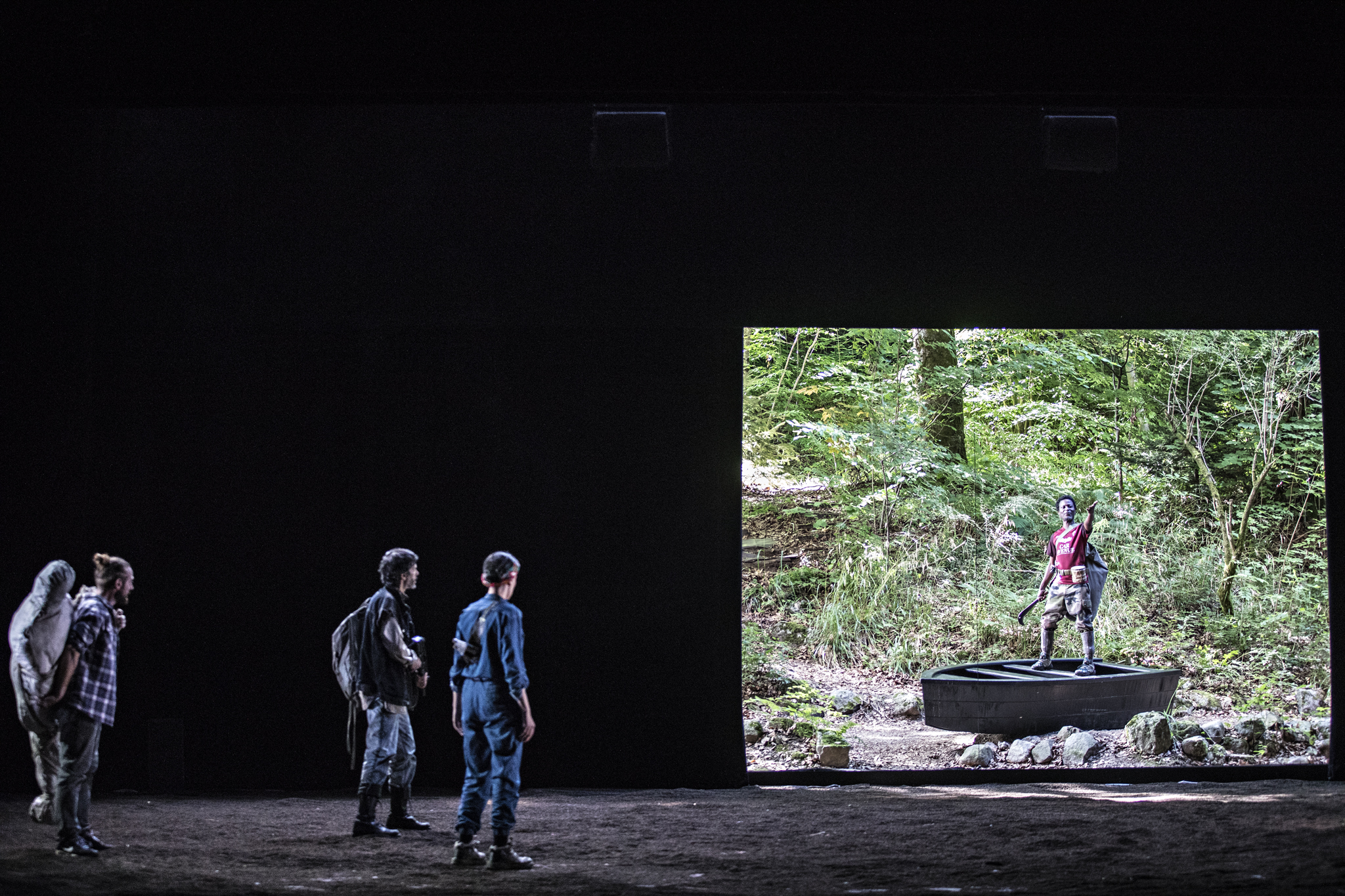 Marche, marche et tu verras. Devise de pélerin qui au terme de son voyage se pose cette question « Qu’ai-je vu ? » et dont la réponse demeure « Retourne-toi et tu verras ». Ainsi peut-on résumer Littoral de Wajdi Mouawad. Wilfrid baisait furieusement quand son père est mort. Drôle de coïncidence, tragique circonstance, lui dont la mère est morte en lui donnant la vie. Mais qui était ce père fuyant toujours son fils ? Et détesté de sa belle-famille qui lui refuse d’être enterré auprès de son épouse. Alors Wilfrid décide d’un dernier voyage, ensevelir son père dans son pays d’origine, le Liban, au village natal. Mais il ne part pas seul Wilfrid, son père mort et terriblement bavard l’accompagne. Et un chevalier, le chevalier de Guiromelan, ami imaginaire de son enfance, toujours là en toute circonstance, un peu envahissant quand même et qui incite à continuer toujours son chemin, à mener le combat. Le pays est en guerre et les cimetières débordent de victimes. Pas de place pour cette dépouille étrangère. Wilfrid, tel Enée, erre et fuit, son père en bandoulière, rencontre Simone, Amé, Sabbé, Massi et Joséphine. A chacun son histoire, sa douleur, son passé. L’un a tué son père, l’autre doit le venger et le troisième ne l’a jamais connu. Simone a perdu son amour interdit dans un champ de mines, Joséphine n’a plus de famille mais note les morts sur les annuaires qu’elle transporte pour ne jamais oublier leurs noms. Ce voyage devient une aventure, une quête initiatique, celle des origines, de l’identité et de la réconciliation des vivants avec les morts. Texte de Wajdi Mouawad et mise en scène par Simon Delétang qui inaugure là sa direction à la tête du Théâtre du Peuple de Bussang. Conciliant l’idéal de Maurice Pottecher, mélanger amateurs et professionnels, Simon Delétang ouvre aussi le théâtre à la diversité, engageant pour sa première saison des acteurs d’origines différentes. Théâtre du peuple, oui mais de tous les peuples donc. Une diversité bienvenue qui s’épanouit avec cohérence dans le choix de cette pièce au sujet universel. Simon Delétang s’empare du texte à bras le corps… qu’il étouffe quelque peu. Optant, sans doute par la différence sensible des niveaux de jeu entre amateurs et professionnels, pour la tragi-comédie plus que la tragédie, il perd quelque peu en route les pleins et déliés d’un texte riche de nuances au profit de l’action, à l’image de cette marche forcée et continue jusqu’à ce littoral devenu Graal. Sa mise en scène au demeurant simple, sobre et par trop littérale, sans effet majeur ni spectaculaire, sauf bien sûr, attendue ô combien, l’ouverture des portes sur la vallée vosgienne avec laquelle il joue et qui opère toujours son effet, c’est inratable, fait marteler le plus souvent avec un débit de mitraillette le texte et les monologues riches de sens de l’auteur deviennent simples tirades jetées en un seul jet et sans trop de nuance. A peine respire-t-on. On aurait souhaité plus d’intériorité. Il n’y a que les interventions incongrues du père mort et les apparitions intempestives et drôles du chevalier qui temporisent quelque peu cette énergie, qui déborde de partout et font lien. Energie qui n’est, c’est vrai, on dira ça, que générosité et nous fait temporiser quelque peu notre jugement. Malgré tout et malgré nous on est embarqué dans cette odyssée de la mémoire parce que le texte de Wajdi Mouawad au final résiste et que Simon Delétang n’a d’autre prétention faussement modeste que d’apporter sur cette scène, après le sens, « joie et plaisir pour un moment privilégié. » La force de Bussang est sans doute là, dans cette communion particulière avec un lieu et son histoire, sa continuité.