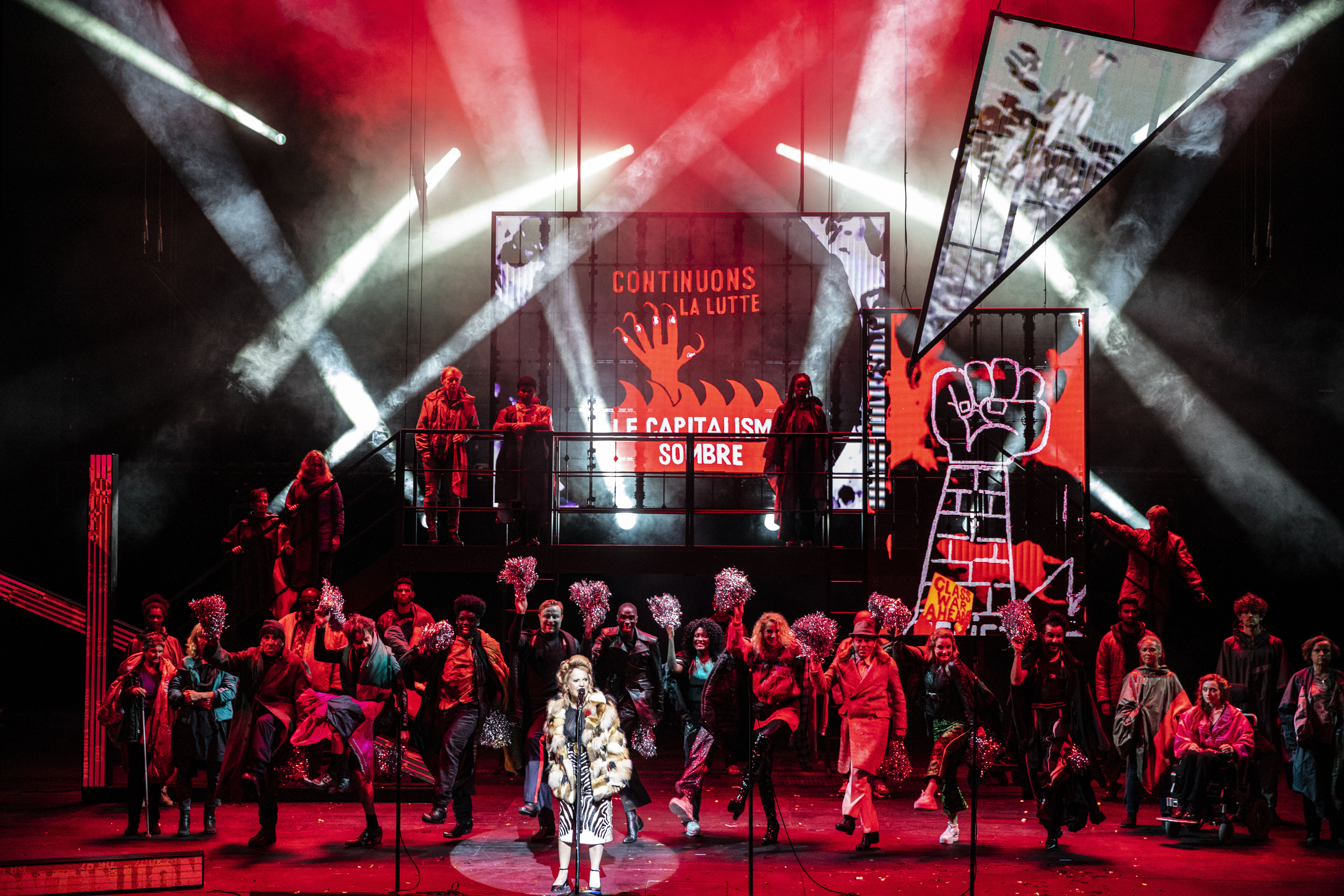 Si l’orchestre Le Balcon, joyeusement dirigé par Maxime Pascal, ainsi que son très beau chœur (dont le rôle est toutefois réduit) donnent une caution musicale à cette création salle Richelieu, ainsi que Marie Oppert (qui a une formation professionnelle en chant) du côté des comédiens-chanteurs, le niveau de prestation vocale des autres comédiens est très inégal, ce qui selon les rôles est plus ou moins gênant, car on n’attend pas non plus le niveau d’une distribution opératique. Si Dominique Vella convainc pleinement sur tous les plans en Célia Peachum et forme un couple truculent avec Christian Hecq et que Benjamin Lavernhe séduit (y compris dans les prestations chorégraphiées) dans celui de Brown, le chef de la police de Londres, les autres rôles manquent un peu de mordant, de méchanceté, de malsain. La direction d’acteurs et l’esprit de cette mise en scène et scénographie se calant sur l’esthétique théâtrale russe des années 20, par leur manque d’inventivité et de laideur viennent affadir un texte qui n’est pas n’importe quel texte, d’un auteur qui était dans le début d’un cheminement d’une œuvre dont l’intention allait se préciser ensuite, tant sur le fond que sur la forme. Les costumes à paillettes, tartes à la crème et bandeaux lumineux dignes des chaînes d’infos en continu (diffusant ici les didascalies de l’auteur ou intitulés d’airs chantés) pèsent peu face au discours d’origine venant critiquer férocement le capitalisme, même si une forme d’utopie pré-marxiste la caractérise.