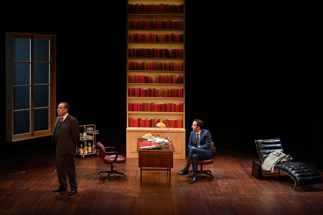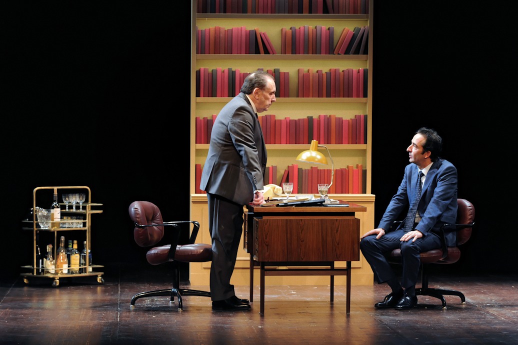 Si comme dans les deux pièces précitées, le metteur en scène et le scénographe n’ont pas opté pour l’originalité et adopté tous les codes classiques du décor intérieur d’un homme politique lettré (bureau en bois, immense bibliothèque qui monte presque jusqu’aux cintres et pleinement éclairée, chaises vintage et grand fauteuil design de lecture), la force de la pièce réside dans le texte qui rebondit sans cesse. Le montage de Georges Naudy est bluffant : un florilège de réparties cinglantes, parfois cruelles, toujours extrêmement drôles dans un duel où il n’y a pas d’égalité des armes. D’un côté, un homme d’expérience, féru de lettres et d’histoire, pouvant citer aussi bien Lamartine que Spinoza, tenant les rennes du parti qu’il a créé et se drapant du devoir « d’assurer l’unité » du parti pour mieux dissuader un concurrent potentiel. De l’autre, un homme « pas si jeune » que cela, aux idées réformistes, notamment en économie, pragmatique, mais peu sûr de lui et qui pour se défendre des attaques et du mépris de Mitterrand l’affronte, lui fait son « procès », y compris sur les aspects les moins transparents de sa vie (Résistance, Vichy, Algérie…). Le dialogue est évidemment fictif et Rocard n’aurait sans doute jamais osé formuler certaines de ses réparties directement à Mitterrand.
