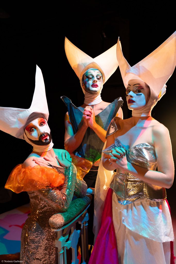 Sur ce plateau nu et blanc, virginal pourrait-on dire, trois prie-Dieu et une malle pour tout décor, l’excentricité crâne dissimule à peine la douleur, la tragédie intime qui frappe chacune des sœurs et qui les décide à engager le combat, entrer en résistance. Entre punch-line définitives, cet humour décapant, cette autodérision queer à nulle autre pareille, et réflexions sur la foi, la charité et l’empathie, la spiritualité sinon le sacré se niche aussi dans les toilettes des lieux de drague. Le frottement entre l’engagement religieux, le sérieux interrogatif de Christine et celui profane des sœurs qui emprunte pourtant aux mêmes codes fait de joyeuses étincelles, de fines escarmouches où la question de l’engagement, laïque ou religieux, se pose et fait débat devant l’urgence d’une situation tragique. Ce n’est pas pour Christine un chemin de croix mais plutôt une révélation dans la joie. Et c’est bien cette joie, voire cette folie, qui traverse cette création, une joie qui fait front et feu de tout bois. Les acteurs ont visiblement fait vœux d’un véritable engagement à défendre ce projet que l’on peut considérer comme militant et cela se voit. Ils ont une énergie, une jubilation mâtinée de gravité et l’émotion affleure souvent qu’une réplique assassine, question de pudeur, étouffe très vite. Un rythme qui ne faiblit pas, une théâtralité assumé – tout se fait et défait à vue –, une mise en scène sans esbrouffe pour ne pas étouffer un sujet sensible ainsi mis à nu. Sons de cloches et tube des années 90 se répondent pour une plongée immersive dans une époque pas si lointaine. Et surtout une vision juste qui ne tombe pas dans la caricature ce que ne sont pas ces activistes où la performance drag, cette visibilité augmentée, agit avant tout comme une déflagration. Et puis cette belle idée d’inviter les sœurs du Couvent de Paris, lesquelles nous accueillent comme elles savent si bien le faire et, invitées au salut, nous rappellent que cette fiction ancrée dans la réalité n’obère nullement cette réalité violente d’un combat contre une pandémie qui continue à bas-bruit. On meurt encore, aujourd’hui, du SIDA.