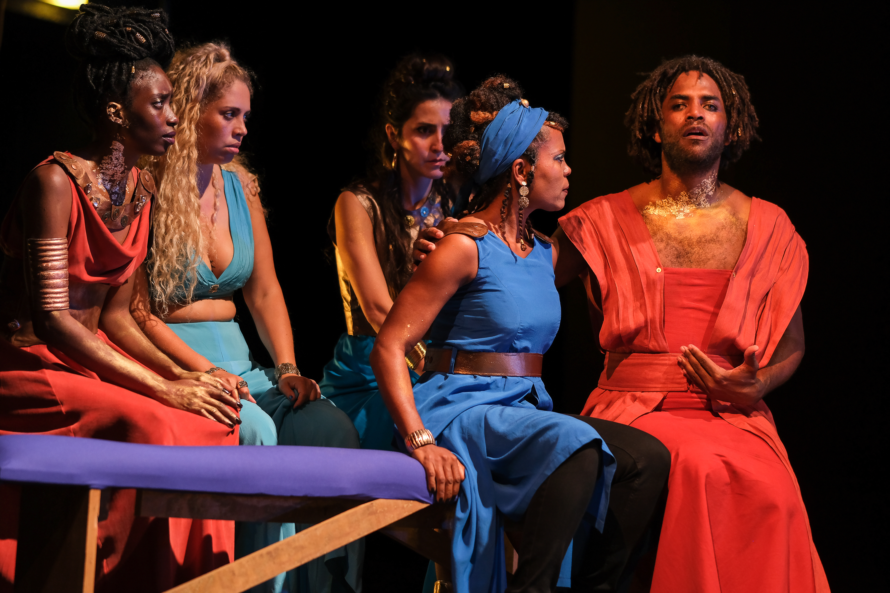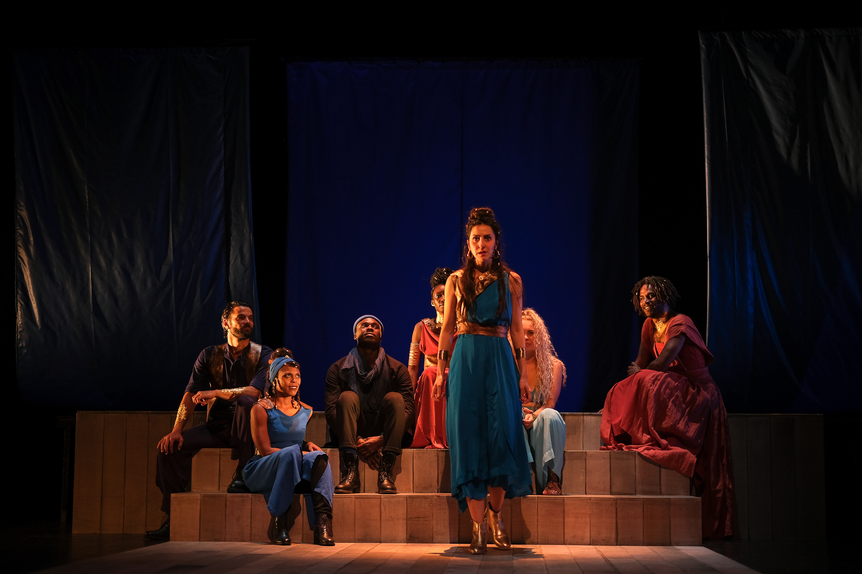 Les lumières sculptent la narration scénographique. Dans le clair-obscur des aplats caravagesques, le noir inspiré de l’esthétique baroque souligne le monde des esprits, les fantômes qui nous hantent, les enfants de Médée, le gisant de son frère égorgé de ses propres mains, le vaisseau fantôme qui l’entraîne d’exil en exil vers sa dernière demeure. Un coryphée interprété par Nelson Rafaell Madel rythme les entrées et les sorties des comédiens, médiateur et figure centrale d’une cérémonie dont on pressent le compte à rebours vers l’issue inexorable ; il accompagne les personnages, les soutient et les incite à continuer coûte que coûte. La composition du comédien à la voix chaude de baryton est magistrale. Son duo avec la chanteuse Swala Emati sur une mélopée créole nous enveloppe tandis que la gestuelle ritualisée des acteurs met en valeur la poésie des textes, accentue les effets rhétoriques ou comiques. Une mention spéciale à Daniely Francisque , une grande Médée qui réclame son dû avec un abattage de reine.