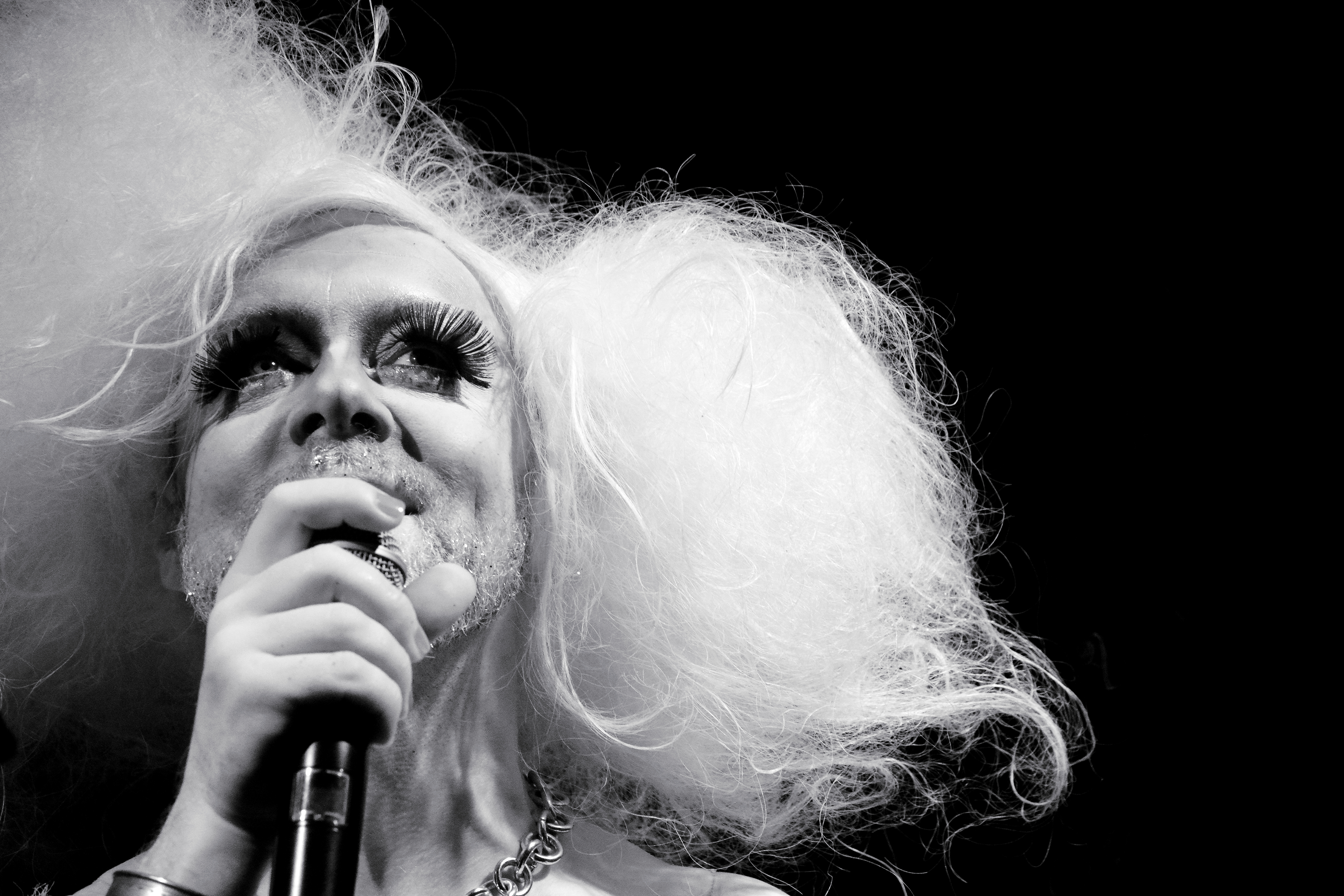 Jamais dans l’imitation mais bien dans l’interprétation et la performance, elles empoignent avec délicatesse, disloquent et mettent à nu les textes qu’elles tirent à elles sans jamais en dénaturer l’essence. Pas de poudre de perlimpinpin malgré les paillettes, sous le strass c’est du sérieux. L’extravagance affirmée n’empêche en rien la rigueur et la profondeur, la vérité des voix. De sacré voix par ailleurs, entre blues, rock et variétoche, et ne font jamais oublier qu’ils sont des chanteurs avant toute chose et de la meilleure eau. La gravité sous le cynisme bravache apparent de Corrine, la folie furieuse et hystérique de Patachtouille, la sensualité rauque de Brenda Moor (et quelles jambes !) font merveille et de chaque chanson mises en scène un voyage en solitaire partagé par un public chamboulé, bousculé avec soumission et plaisir masochiste par Corrine, maîtresse loyale et de cérémonie, loin d’être funèbre. Chacune ou chacun comme on voudra, les notions de genres sont allégrement transgressées cul par-dessus tête, poivre à sa façon unique chaque texte et démontre sans paradoxe combien Alain Baschung était un immense auteur, d’une sensibilité écorchée, un univers entre chien et loup oscillant entre amours dézinguées et douce violence, à la marge toujours des conventions têtues, d’une poésie solaire et brumeuse, énigmatique parfois. Et ça, nos queens pailletées elles savent, qui du fond des cabarets interlopes beuglent avec un foutu talent ces amours ravagées, sublimées, fantasmées, capables de transfigurer la moindre rengaine en tragédie. On se dit que oui, il y a chez Alain Bashung l’échos blues et rock des torch-song propre au drama-queen, plus âpres que larmoyant, certes, et que ces trois-là, ajoutons Charly Voodoo, ont toute légitimité pour défendre toute griffes laquées sorties cette brève anthologie qui porte l’amour en bandoulière, pour citer Alain Baschung lui-même. C’est donc en sautoir qu’elles le portent haut, elles qui savent aussi se dépouiller de leurs attributs clinquants de vierges folles, laissant tomber perruques, plumes et falbalas pour apparaître comme la vérité toute nue sur « Madame rêve », remettant pour ainsi dire les choses à plat et sans faux plis dans un final auquel on ne s’attendait pas. Ces créatures-là, ayant pris crânes la contre-allée, sont avant tout et plus que tout de sacrés et talentueux artistes, de grandes dames de la chanson !
