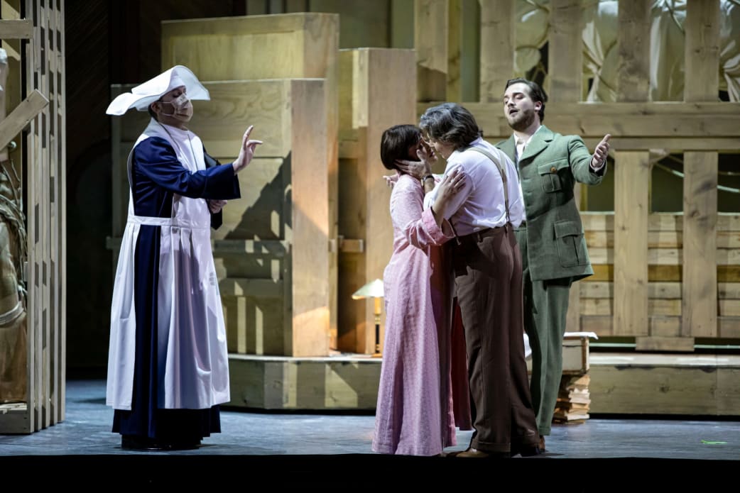 Vincent Huguet propose une mise en scène équivalente à celle de 2020 dans les mêmes grandioses décors d’Aurélie Maestre et costumes chatoyants (voire trop dans la scène du Cours-la Reine) de Clémence Pernoud, transposant l’action qui se situe normalement sous la régence du duc d’Orléans dans les Années folles, avec faste, que ce soit les immenses façades Art déco de la cour de l’hôtel d’Amiens, la chambre des amants ou dans le plateau nu avec deux immenses tableaux de Delacroix dans le séminaire de Saint Sulpice. Cette idée est loin d’être choquante car elle résonne avec l’appétit de Manon pour tous les plaisirs de la vie, la frivolité à l’excès, la liberté d’aimer avec passion tous ceux et celles qu’elle trouve aimables et qui l’aiment, mais aussi son attachement à tout ce qui brille et la fait briller et qui lui brûlera les ailes. Sur ce dernier point, la fin de Manon varie. Dans le roman de l’abbé Prévost (intitulé l’Histoire du chevalier des Grieux et de Manon Lescaut et paru en 1731) sur lequel Massenet et ses librettistes se sont appuyés (et qui a inspiré également à Puccini une décennie plus tard son Manon Lescaut), l’action s’achève en Louisiane où Manon est condamnée à la déportation comme prostituée. Dans l’opéra de Massenet, Manon meurt dans les bras de des Grieux sur une route l’emmenant sous escorte vers le Havre. Vincent Huguet en 2020, avait choisi de la faire fusiller devant son amant, en 2022 elle expire quasiment dans les bras de celui qui l’aime d’un amour inconditionnel avant d’être emmenée par des soldats, permettant ainsi de ne pas montrer sa fin tragique sur le plateau, dans un esprit plus conforme au genre opératique dans lequel s’inscrit Massenet.