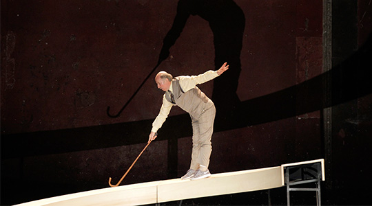 Une curieuse spirale, à mi-chemin entre la machine à jouer, l’agrès et l’engin de torture, occupe tout l’espace. Marcel va devoir gravir ce chemin de croix, de rêveries lunaires en frénétiques accès de nostalgie, jusqu’à la révélation finale. Enfin, un gros paquet cadeau descend lentement des cintres, berçant en son sein une bien triste surprise : une canne, indiscutable attribut d’une vieillesse tant redoutée.
