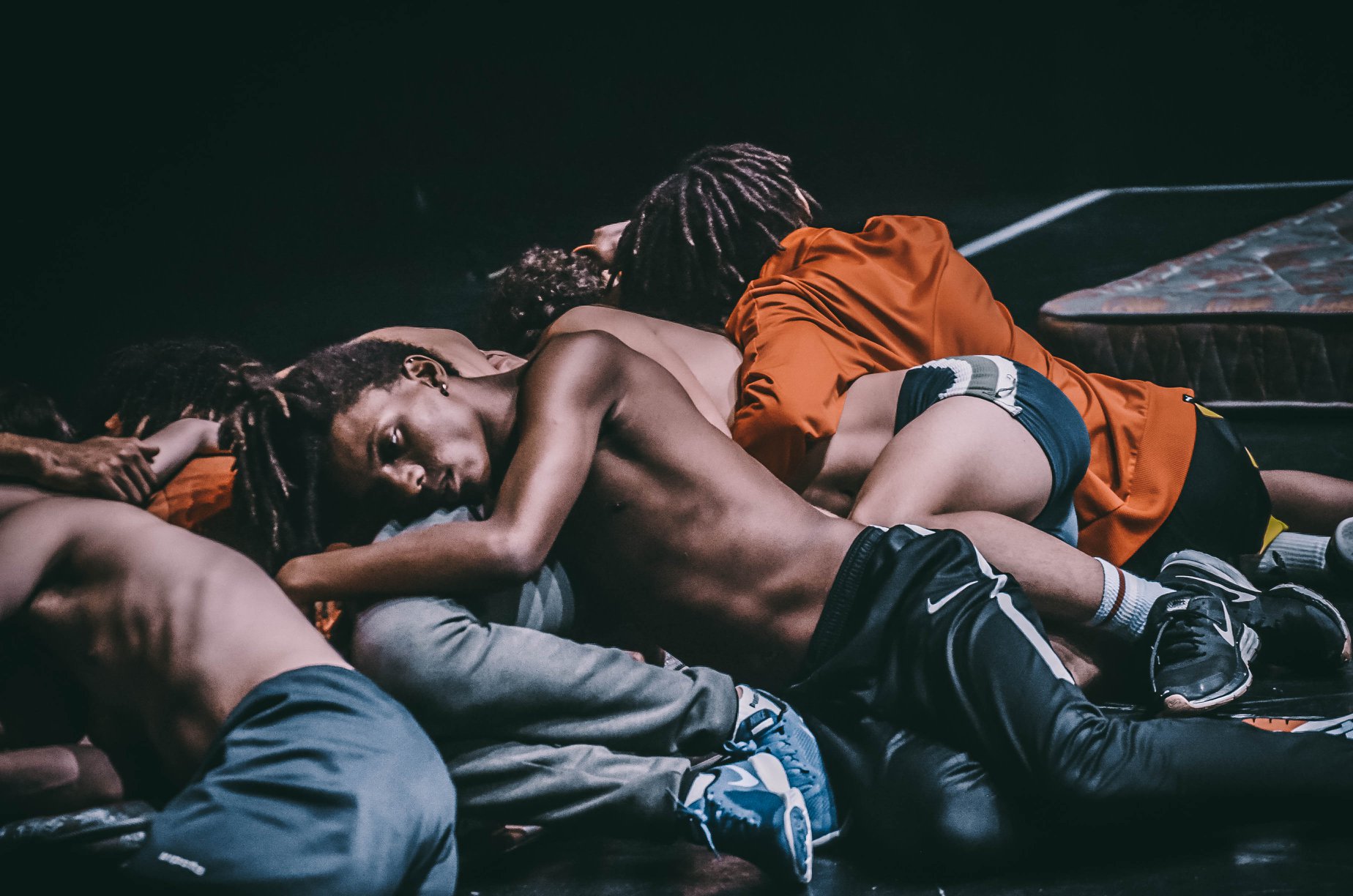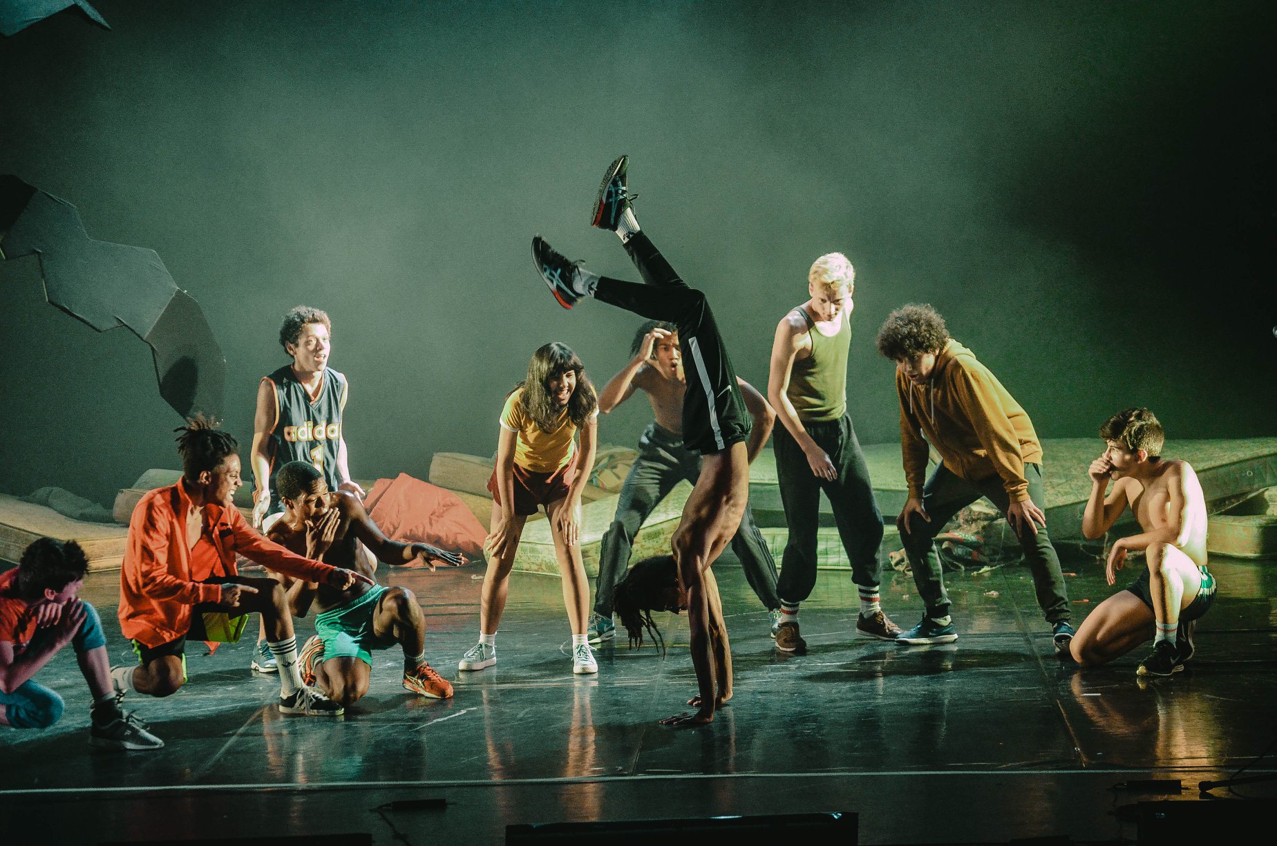 Victor Hugo Pontes n’en fait aucune illustration, tout ce passe actuellement, dans des familles d’accueil, il a recréé un univers et il nous y plonge dès les portes du théâtre ouvertes. Les spectateurs entrent, sont placés, et sur la scène, un groupe d’enfants, d’ados, jouent ensemble, à la balle, près d’un palmier noir, près de matelas sans nom posés au sol. Nous sommes tous là et ils commencent. En fait, ils vont nous raconter leurs vies, par touches, tout en continuant à danser, jouer. Un livre en main, ils montrent le lien entre ce bouquin qui a pu ouvrir tant de portes et ce qui se passe ce soir. Ils sont presque une vingtaine, des garçons et une fille, et débordent d’énergie ? C’est une communauté qui va parler de ses parents morts, des peurs, des larmes, qui va avouer les vols, pour manger, qui va se battre, et aussi se demander ce que c’est que l’amour, si ça existe vraiment, si c’est cette chose bizarre qui se termine au lit avant de terminer tout court ? L’union est là mais glisse de temps en temps, deux garçons ensemble ? Il faut leur casser la figure. Envie d’une fille ? Pourquoi tenter de lui demander son avis ? Du noir et du blanc, du bien et du mal. Là où ils sont en quelque sorte.
