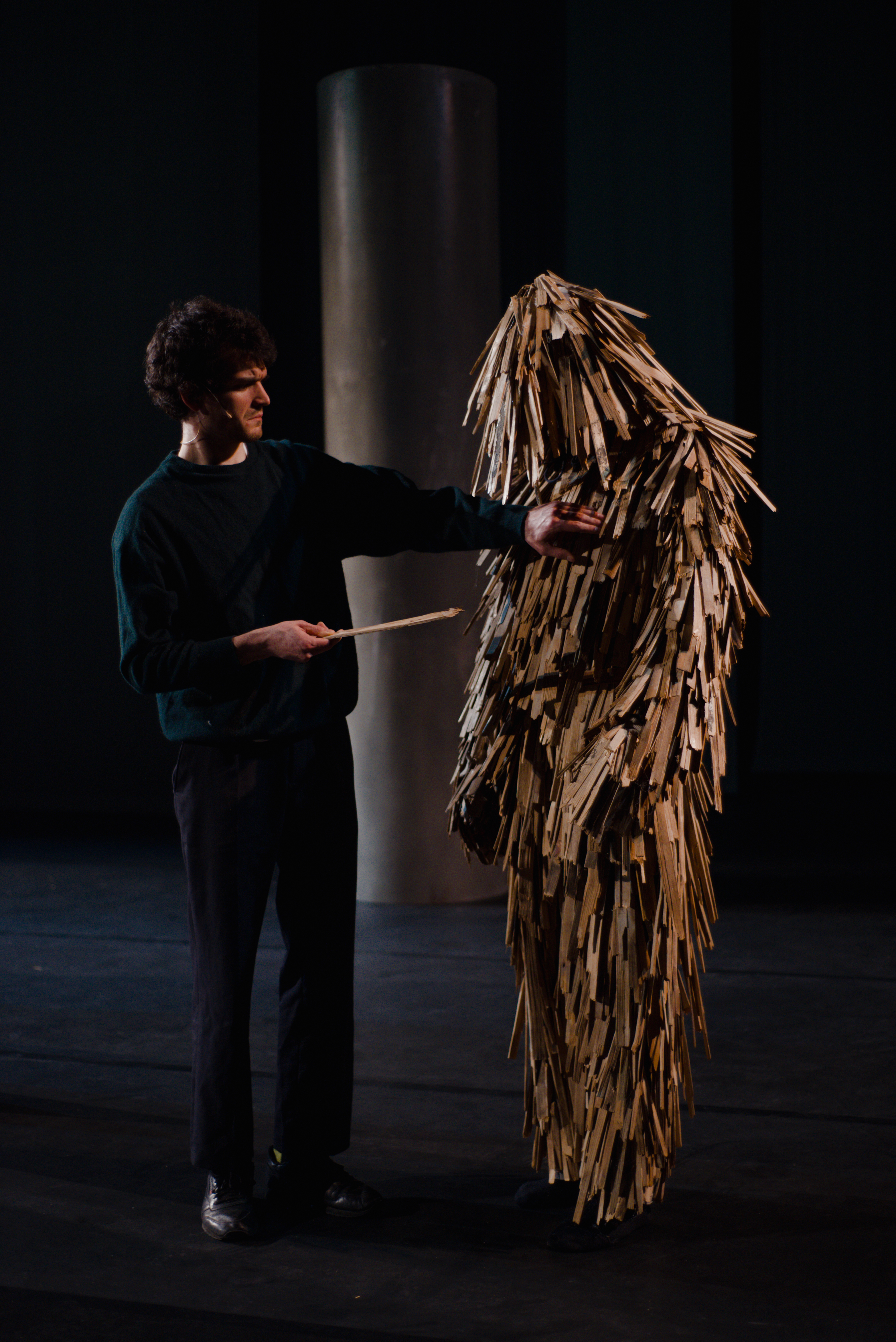 Il y a des créations énigmatiques et austères qui font crânement preuve d’audace bluffante et sans concession au risque de l’incompréhension. Matisklo est une étrange et fascinante expérience. Il faut se laisser happer par cette mise en scène, s’abandonner aux sensations pures et contradictoires qu’elles génèrent, de l’agacement à la soumission volontaire. Pas facile. Bosse Provoost devant l’impossibilité à représenter sinon à incarner la langue hermétique du poète Paul Celan, poète juif et roumain, une œuvre traversée par la Shoah, n’accuse aucunement l’échec d’une tentative mais se détourne sciemment de la représentation classique. À Paul Celan et sa contre-parole*, réponse ultime au silence de l’Histoire et mise en accusation de la culture allemande dont la Shoah était l’aboutissement, langue de la résistance et de la résilience, Bosse Provoost propose une vision théâtrale tout aussi radicale. Devant une poésie fait de fragments, d’éclats, de monosyllabe, de silence, de disparition, traversée par la mort, Bosse Provost ne cherche aucunement à incarner mais habilement met en scène l’échec de cette incarnation résolument impossible. L’impuissance du comédien devant cette poésie, véritable astre noir qui résiste à toute interprétation. C’est donc la scénographie qui portera les questions posées par cette poésie fragile et insaisissable, la scénographie comme un vaste imagier où l’acteur même, libéré de la parole, participe de ce processus, n’en n’est plus le centre mais un des éléments, une partie de l’environnement. Technique, matière, mouvement, lumière, son, espace, comédien forment un tout, un environnement global, un écosystème chargé de sens et de correspondances ténues, traversé de silence. Une stylisation extrême, austère. Quelques hauts futs et devant ces cheminées de crématoires l’aphasie d’un comédien désarticulé… Voilà pour « Renverse du souffle », évocation de la Shoah. D’autres images surgiront, énigmatiques, symboliques. Les comédiens parfois s’emparent du texte, de ces fragments tentent une traversée, s’y reprennent, têtus, à plusieurs fois avant de renoncer. Ce n’est pas tant le texte que cherche à illustrer Bosse Provoost que sa représentation mentale, ce que la poésie projette au-delà du signe, loin de tout formalisme ou naturalisme. Trouver la part obscure voire inconsciente de Paul Celan. Bosse Provoost, à sa façon, est un surréaliste. C’est à la fois d’une grande austérité, exigeant et sans complaisance, d’une grande pureté.
