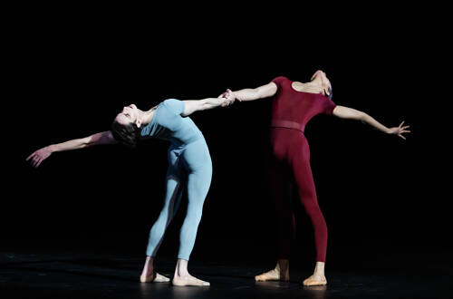 A la différence du premier ballet, il n’y a peu d’effet de lumières dans Le Chant du compagnon errant, créé en 1971 par Noureev et Paolo Bortoluzzi. La seule particularité est qu’il s’agit d’un ballet monté sur des lieder composés par Gustav Mahler, dont l’exécution par le baryton Thomas Tatzl ne nous a pas totalement convaincue (surtout dans l’attaque du premier lied). Les deux danseurs apparaissent sous une douche de lumière dans des collants et justaucorps très sobres, l’un bleu, l’autre bordeaux. La chorégraphie dans laquelle excellent Guillaume Diop et Marc Moreau, est également très épurée. Il faut une présence scénique de très grande qualité pour occuper les regards sur cet immense plateau vide et elle ne fait aucun doute pour les deux très jeunes étoiles, qui montrent en outre entre eux une belle complicité, tellement essentielle dans ce duo qui n’est autre que les deux faces d’un même personnage. L’extrême fragilité intérieure du Compagnon est idéalement exprimée par la sensibilité à fleur de peau de Guillaume Diop, léger dans toutes les difficultés techniques et d’une fluidité sans pareil dans tous les passages qui le requièrent, le mouvement ne s’arrêtant jamais, la dernière phalange de chaque doigt terminant chaque mouvement jusque dans la dernière micro seconde possible. Marc Moreau est également remarquable dans une plus grande sobriété émotive qui tient au côté plus sombre de son rôle. Nous avons hâte de les revoir reprendre ces rôles, voire même ce duo dans une décennie ou plus, une fois que la vie aura nourri l’inévitable errance intérieure.