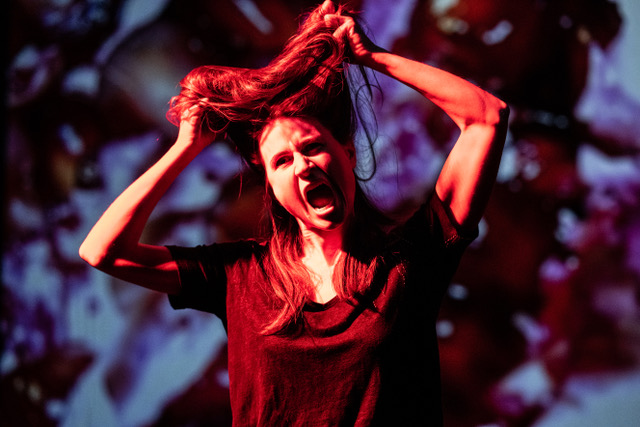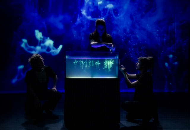 Sophie Delacolette, Alice Martinache et Héloïse Meire, les trois talentueuses comédiennes qui se passent chacune à leur tour le rôle de Méduse, ainsi que de nombreux autres personnages, auxquelles on doit également la conception et l’écriture, nous guident dans la vie de la jeune Méduse. Accompagnées par une scénographie riche (presque trop parfois), vêtues de noir, avec pour principal décor, trois boîtes utilisées de manière très polyvalente, un écran, et un aquarium, c’est une stimulation continue des sens qui attend les spectat.eur.ice.s. Un jeu de lumières, de sons et de matières maintiennent nos capteurs sensoriels éveillés tout du long. Cet usage passe par la manipulation du papier, de l’eau et même de la peau si bien que l’on sentirait presque leurs doigts se poser sur notre corps. L’utilisation de fluides fluorescents ajoutée notamment aux images de ce toucher projetées en direct nous tire, nous aspire presque, à l’intérieur de ce récit mythique, à la fois surnaturel et très réaliste. La musique créée et jouée sur le plateau par Loïc Le Foll magnifie cette catharsis des sens, laquelle mêlée au récit du viol de Méduse par Poséidon et entrecoupée par les témoignages de réelles victimes d’agressions sexuelles en voix off ne nous donne d’autre choix que de plonger dans les ressentis puissants de leurs traumas. Néanmoins, grâce à l’équilibre procuré par le rythme de la scénographie et le talent des comédiennes, la légèreté, elle , ne nous suffoque pas et n’a conduit personne le jour de la générale à sortir de la salle. Les spectat.eur.ice.s avaient été prévenu.e.s et autorisé.e.s à le faire, dans un prologue créant une forme d’avertissement original sur la possibilité de sentir notre sensibilité heurtée et le besoin de « crier un bon coup ». Cette annonce en forme de boutade installe curieusement un lien fort d’écoute, de compréhension entre la salle et le plateau et même entre les spectat.eur.ice.s eux-mêmes, rendant légitime l’émotion aussi intense soit elle, suivant l’histoire de chacun.e.
