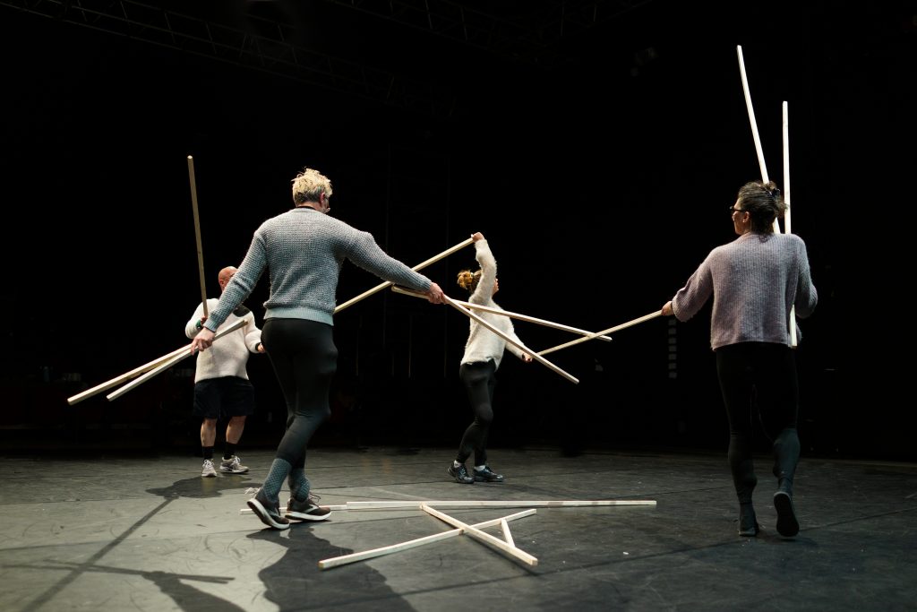 Et on voit. Rien… Nous sommes dans un espace fantastique et inutilisé et deux hommes, deux femmes vont, avec de gentils sourires, ligoter de vieilles et longues branches, façon cabanes ou tepee, avec de jolies cordelettes de laines de couleurs, pelottes traversant la scène et faisant quelques haltes à travers le poignet de tel ou tel visiteur, pour que tout tienne debout. Rien de bien grave, des gesticulations sans grand intérêt mais qui vont sans doute se transformer en gigantesque surprise, les chants plats de ce qu’on peut prendre pour des ados sans grand esprit nous poussent vers un étonnement dont nous nous souviendrons. C’est tout à fait cela, nous parlerons de Mirages et tendresses : nous pensions que c’en était un pour lequel nous n’en aurions aucune.