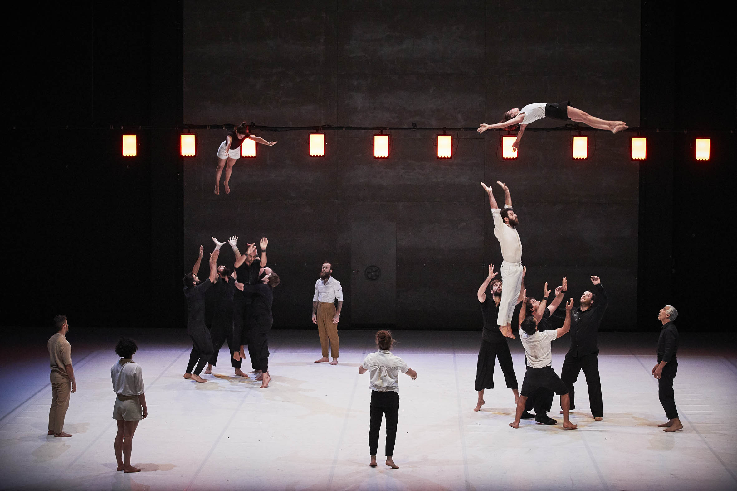 La vitesse et la lenteur sont mêlées. A un instant tous sont au sol, quasiment perdus, enchevêtrés, juste après, plus personne, juste une, un, et à nouveau l’ensemble, qui nous emporte. Möbius, et l’acrobatie, Möbius, et l’équilibre, le déséquilibre. Möbius, et l’espoir que tout se passe bien. Dans la salle encore, des mains se tiennent, pour échapper à de possibles tremblements, eux tremblent de concentration, physique et pas seulement, dans les gradins ces frémissements sont ici ou là presque premiers, une peur, oui, une pluie de comment font-ils, font-elles ? Les pas s’entendent, la folie douce et tendre, ne s’éteint pas ou si, juste une fois, donnant l’idée de s’envoler sur un claquement de doigt, la lumière s’éteint, tout est fini. Alors les spectateurs se relâchent, se lèvent à leur tour les mains ne tremblent plus, elles applaudissent, joyeuses, et soulagées ?