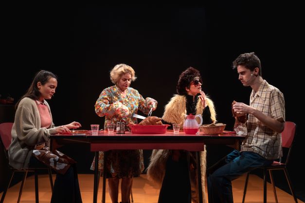 Et toute résonnance avec son roman autobiographique J’ai tué Barbara* ne serait pas si fortuit. Aurions-nous donc là un savoureux autoportrait-chinois en creux, au vitriol et sans complaisance ? Sans doute, mais pas que. Parce qu’il y a dans cette affaire Pauline Chagne qui partage avec l’auteur la même admiration pour l’ermite de Précy-sur-Marne et qui décidât un jour d’adapter à sa manière et avec la complicité curieuse de son auteur Moi aussi je suis Catherine Deneuve . Repris et donc adaptée à l’aune d’une addiction commune pour l’auteure de L’aigle noir. Culotté, mais réussi. Et Pauline Chagne dans cet exercice d’admiration pour la chanteuse, parce que s’en est un aussi, se glissant dans la peau de Geneviève/Barbara est époustouflante. Tout y est qui doucement emporte Geneviève vers une folie qui la sauve de la médiocrité de son destin, qui fait de cette cuisine son ultime Châtelet. La voix jusque dans le chant, l’intonation si particulière, le souffle et le geste si singulier, le costume. L’aigle noir n’a beau ici être qu’un triste poulet, Barbara est bien là, réincarnée et l’on est quelque peu troublé de cette performance qui se refuse à l’être. Parce qu’il ne s’agit pas d’un hagiographie de Barbara, madone empathique des cas souvent désespérés, mais du portrait d’une jeune fille, tout aussi désespérée, qui s’invente en Barbara. La nuance est importante que souligne la subtilité du jeu de Pauline Chagne qui lentement se défait de Geneviève pour devenir Barbara. Car la dure réalité demeure, on a beau répondre à Denise Glaser, l’aspirateur passe avec son boucan d’enfer dans la cuisine. Jean-Charles Mouveaux a bien saisi la dinguerie anxiogène de l’univers chère à Pierre Notte, le fracas intérieur et explosif des membres de cette famille mal accordée qu’il met en scène sans chichi, sans jamais en faire trop dans le burlesque, gardant mesure en toute chose préférant la finesse à la surenchère, faisant surtout toute confiance au texte, un respect où la langue trempée de vitriol est ainsi exacerbée, exhaussée comme il se doit, que ponctuent les chansons de Barbara, comme un baume sur des plaies à vif. S’appuyant sur des comédiens qui de ce texte font assurément leur miel, où leur fiel ici, dirigés au cordeau et qui dessinent leur personnage sans jamais forcer le trait mais avec beaucoup d’humanité aussi déglinguée, ravagée soit-elle. Pauline Chagne, donc. Mais aussi Flore Lefebvre des Noëttes, la mère, borderline et dépassée. Marie Nègre, d’une douceur toxique, qui chante excellement son mal-être. Et Jimmy Bregy, le frère mutique et cabossé. On a beau planquer fissa ici hachoir et couteau, tout ça est aiguisé et tranchant. Et terminer ce jeu de massacre familial par « Ma plus belle histoire d’amour », ça pourrait paraître gnangnan et franchement tarte, cela n’en est en fait que plus cynique et corrosif.