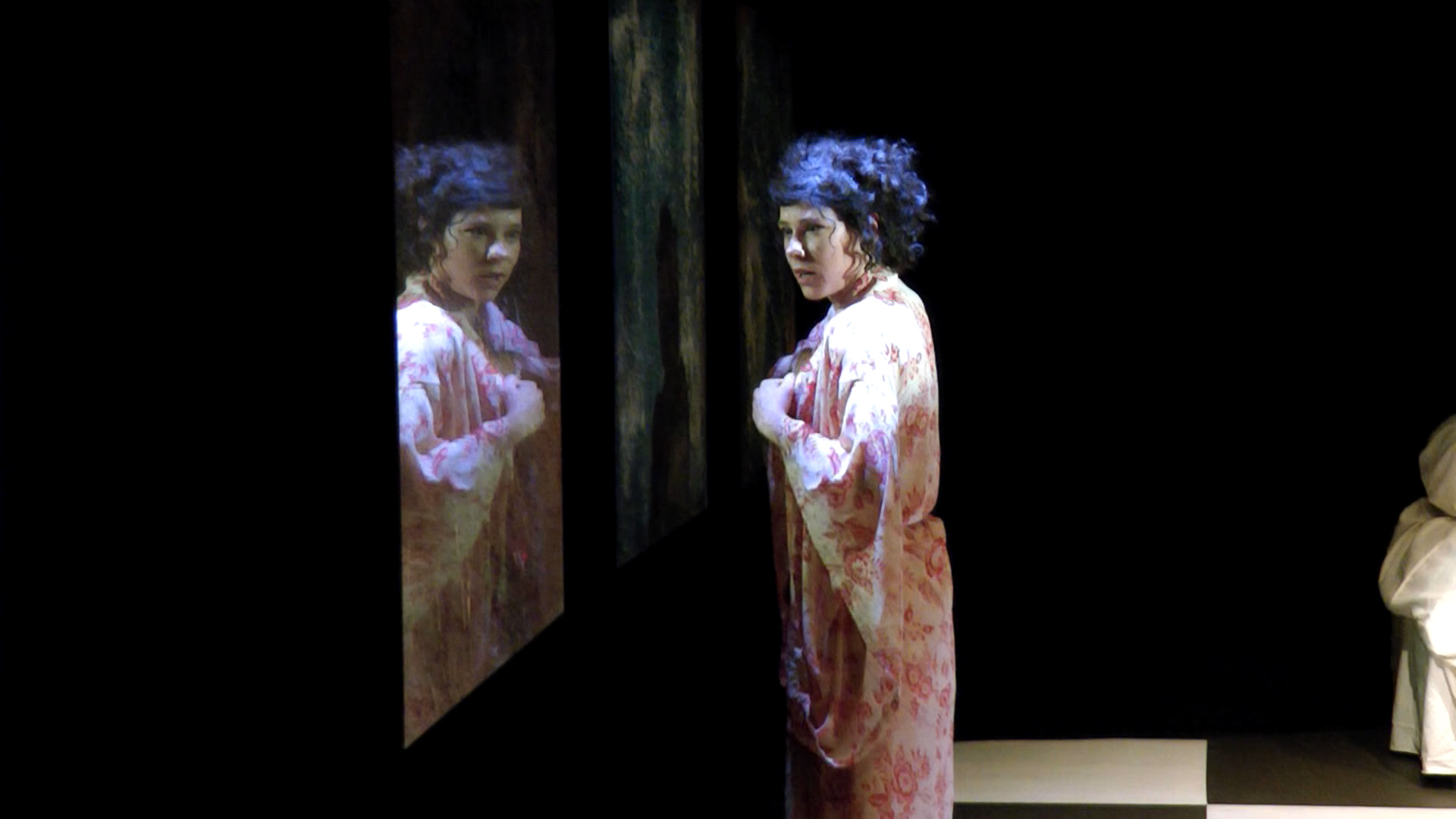 Sur le plateau des Déchargeurs, une chambre à coucher, avec une légère impression de guingois, semble rompre les lois de la perspective comme dans un tableau de Van Gogh. La scène a quelque chose de ramassé, et en même temps d’étiré, une subtile dislocation de l’espace. Espace physique et a priori espace mental. Y contribuent le sol en damier noir et blanc, ces miroirs sans cadre suspendus côté jardin, maculés de vieillesse, où le reflet est troublé par la matière, et puis surtout, au fond du plateau, ce lit orienté de profil, occupé tête-bêche par Molly et Léopold. Léopold, englouti sous les draps, aux dimensions monstrueuses.