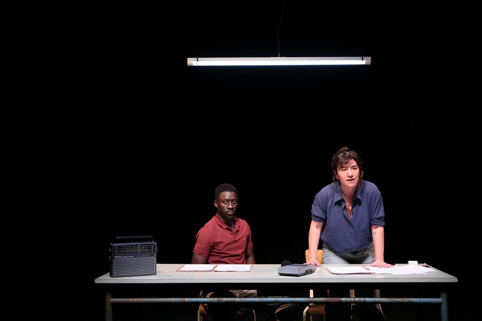 La pauvreté du décor (une table, quatre chaises de collectivité et un néon) rappelle volontairement le dénuement du mobilier de la commission Vérité et Réconciliation. Et l’utilisation de micros, d’enregistrements et d’un poste de radio vient insister sur l’importance de ce média pour relayer les informations qui circulent à l’intérieur de la commission.