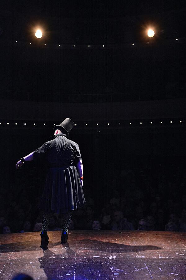 Monsieur K est un maître de cérémonie volontiers atrabilaire, certes, esprit caustique pour cravache sifflante sur nos têtes, mais de ce cabaret il fait un antre interlope où règne la rigueur et le foutoir, l’assurance et la fragilité, la transgression et l’outrance, la folie propre au cabaret et qui lui donne toute sa saveur, sa valeur, son excellence. Espace social et politique, artistique, là, le monde comme il va n’y est pas à la porte, il y rentre avec fracas avant d’être promptement déculotté, mis à nu et fouetté en public. Et le public, complice, d’applaudir sans barguigner, voire de danser le tango.