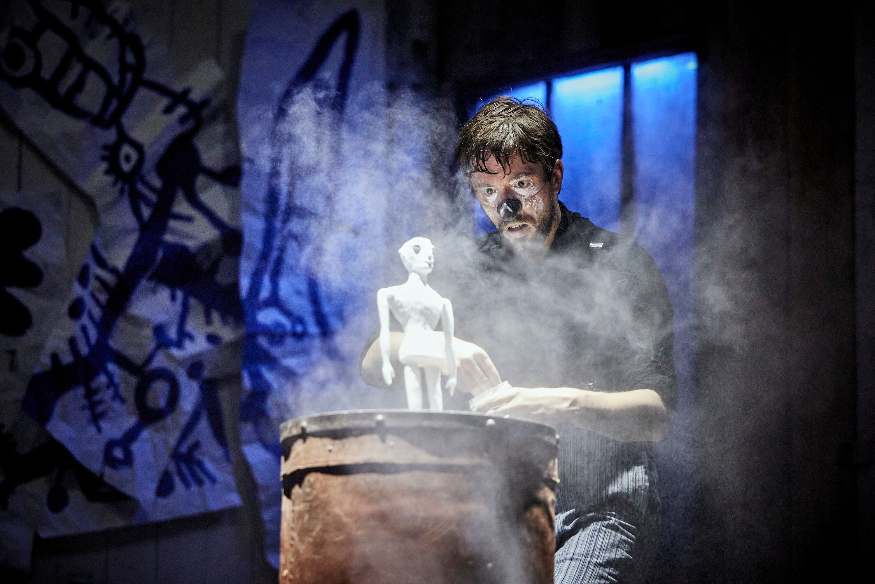 Pierre, le narrateur interprété par l’auteur en personne, raconte l’histoire de sa mère, Masha, actrice née dans un pays de l’Est et de Rezzo, son grand père, qui un soir raconte à sa fille Masha l’histoire d’un théâtre au nom mystérieux « La Baleine Bleue », coffrage en bois créé par son père. Dehors le bruit des bombes a tout détruit, excepté le ventre de la baleine où ils se réfugient l’espace d’une nuit. Simon Falguière est cette poupée russe qui glisse d’un rôle à l’autre, l’air de rien avec un jeté de doigt comme indépendant du corps, une robe couleur de temps, un dos qui s’arc-boute, un bras qui s’arrondit et un nez en trompette noir. Acrobate céleste, il traverse l’espace-temps à compter du Big Bang, assemble des dessins aux formes bleues comme les constellations de la voie lactée. Apparaissent les espèces invertébrées et vertébrées et enfin l’Homo sapiens. Avec lui naît la volonté de puissance et le pouvoir de nuisance sur les beautés de la planète bleue. On entend une voix off murmurer les mots tirés des Métamorphoses d’Ovide « au commencement, il y avait le chaos. Kaos. Et puis Kaos enfanta Gaïa la Terre. Puis Kaos enfanta Éros, l’Amour. Lui c’est le plus beau des dieux. Puis Kaos enfante Ereb, les ténèbres et Nix, la nuit obscure. Puis Ereb et Nix par leur amour, enfantèrent la lumière du jour… ».  Des figurines surgissent de trappes manipulées par des accessoiristes, les tiroirs s’ouvrent tout seuls et des cubes multicolores apparaissent contre lesquels se bat le grand échalas élastique au pantalon à bretelles.