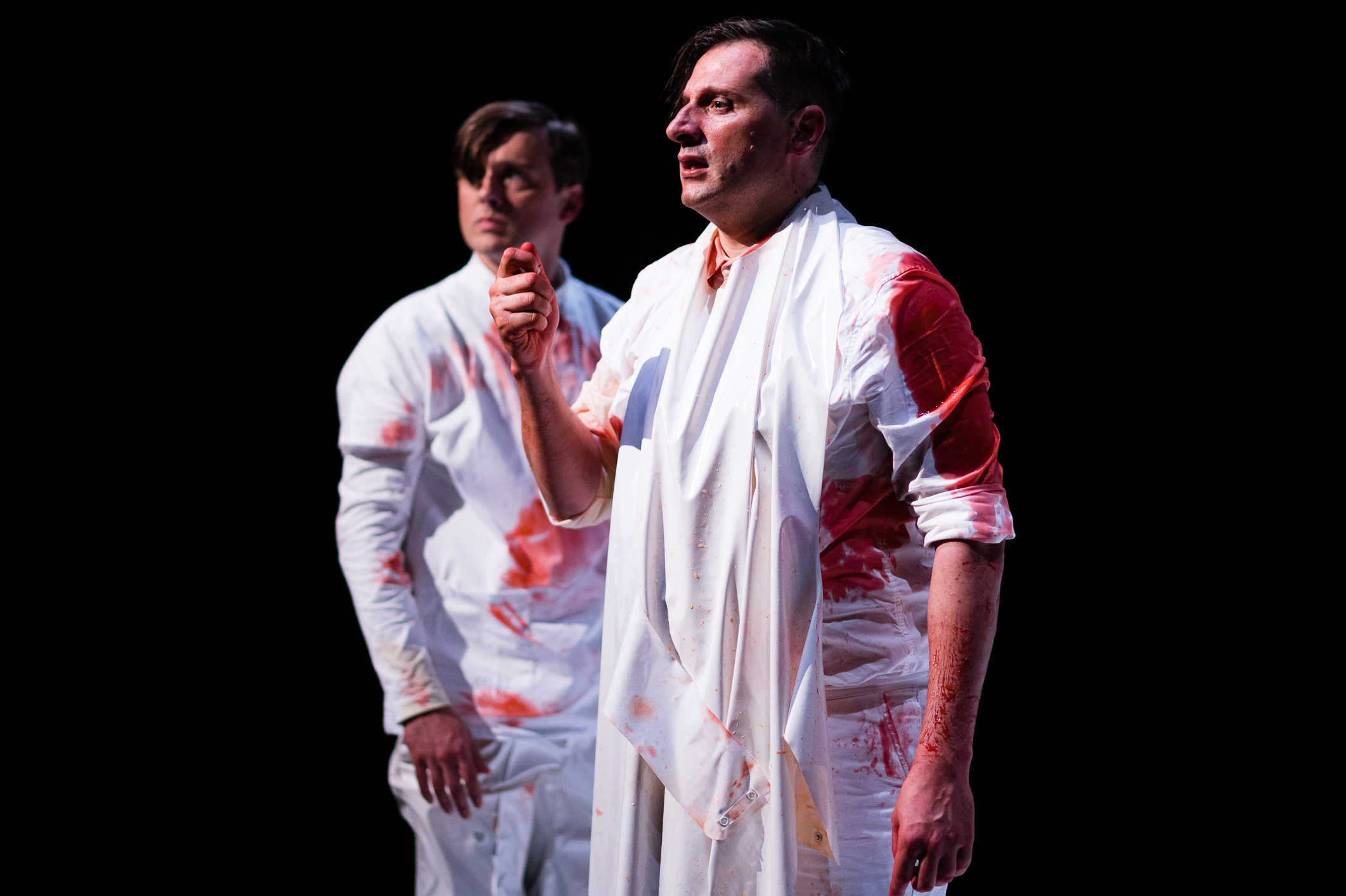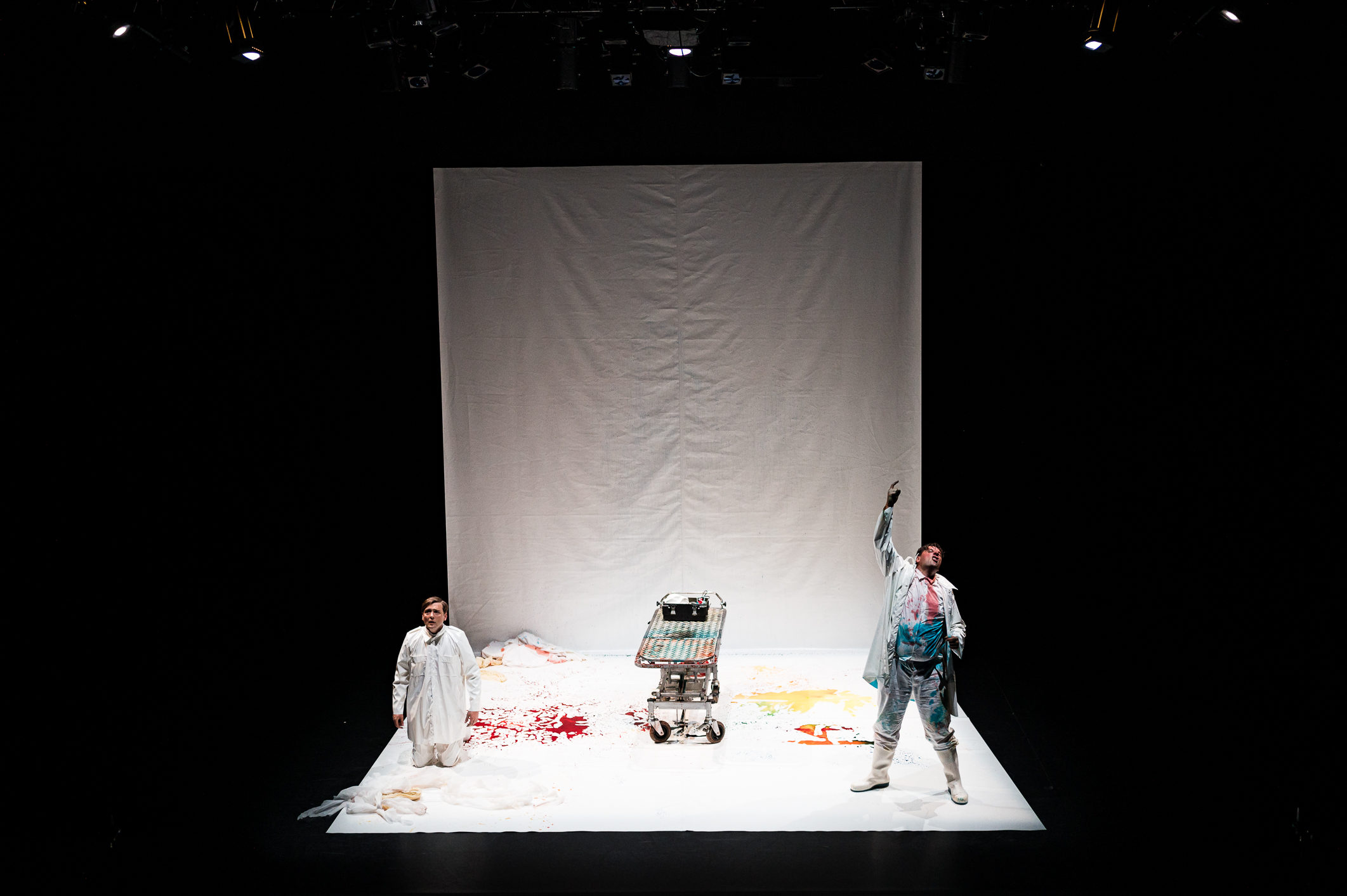 Deux textes de Mikhaïl Boulgakov, Morphines et Carnets d‘un jeune médecin, réunis en un seul récit et sans couture apparente. Une greffe réussie pour un récit qui vous happe et une mise en scène qui opère sans que l’on y prendre garde un virage à quatre-vingt-dix degrés et vous laisse, au final, sur le carreau. Histoire d’un jeune médecin, tout juste diplômé, parachuté au fin fond de la campagne russe. Inexpérimenté, assailli de doutes, isolé, insomniaque, peu à peu la morphine devient son refuge. Histoire d’une addiction et d’une terrifiante descente aux enfers. Mariana Lézin, la metteuse en scène, dans son adaptation qui relie les deux textes pour n’en faire qu’un, conserve cependant les deux personnages protagonistes de chaque nouvelle, Bomgard et Poliakov. Ils sont donc deux sur le plateau mais n’est-ce pas le même personnage dans l’expression de sa schizophrénie ? Ou sont-ils les témoins fusionnel l’un de l’autre de cet enfer ? N’y a-t-il pas non plus un transfert, comme une lente et fatale contamination de Bomgard à Poliakov, à moins que ce soit l’inverse ? Mariana Lézin ne tranche pas, volontairement, et sème le trouble. Etrange mise en scène aussi, surprenante et qui vous conduit là on ne s’y attendait pas. Tout commence par du grand-guignol, une farce burlesque et macabre. Humour noir et litres de sang. Amputation, extraction de dents ou accouchement, ça saigne, gicle, éclabousse. Le sang est rouge, bleu, voire jaune. On rit beaucoup. Jusqu’à la première injection de morphine. Là, comme corrompue lentement par cette addiction la mise en scène de farce devient tragédie poisseuse. Mariana Lézin peu à peu en retire tout le spectaculaire, assèche tout effet, épure jusqu’à l’os pour ne se concentrer que sur le récit halluciné de Poliakov et de sa dépendance de plus en plus grande. Désormais, c’est dans la tête de ce dernier que Marina Lézin fouaille pour en extraire l’essence de sa douleur, laquelle envahit le plateau devenu espace mental d’une addiction, d’une folie que plus rien ne semble arrêter. Le noir profond c’est substitué au blanc éclaboussé de sang. La dernière image, inéluctable, porte en elle, dans son ambiguïté même, une clef dans la lecture de cette création vertigineuse : la rédemption par la mort ou l’écriture. Il faut aussi souligner la performance des deux comédiens qui plongent dans les abymes de ces personnages, qui peut être ne font qu’un, avec un talent certain sans jamais tomber dans l’outrance mais au contraire gardent, même dans le grand-guignol, une mesure, une sincérité telle qu’ils préservent cette part d’humanité, jusque dans la douleur, qui donne à cette création sa profondeur et sa justesse.
