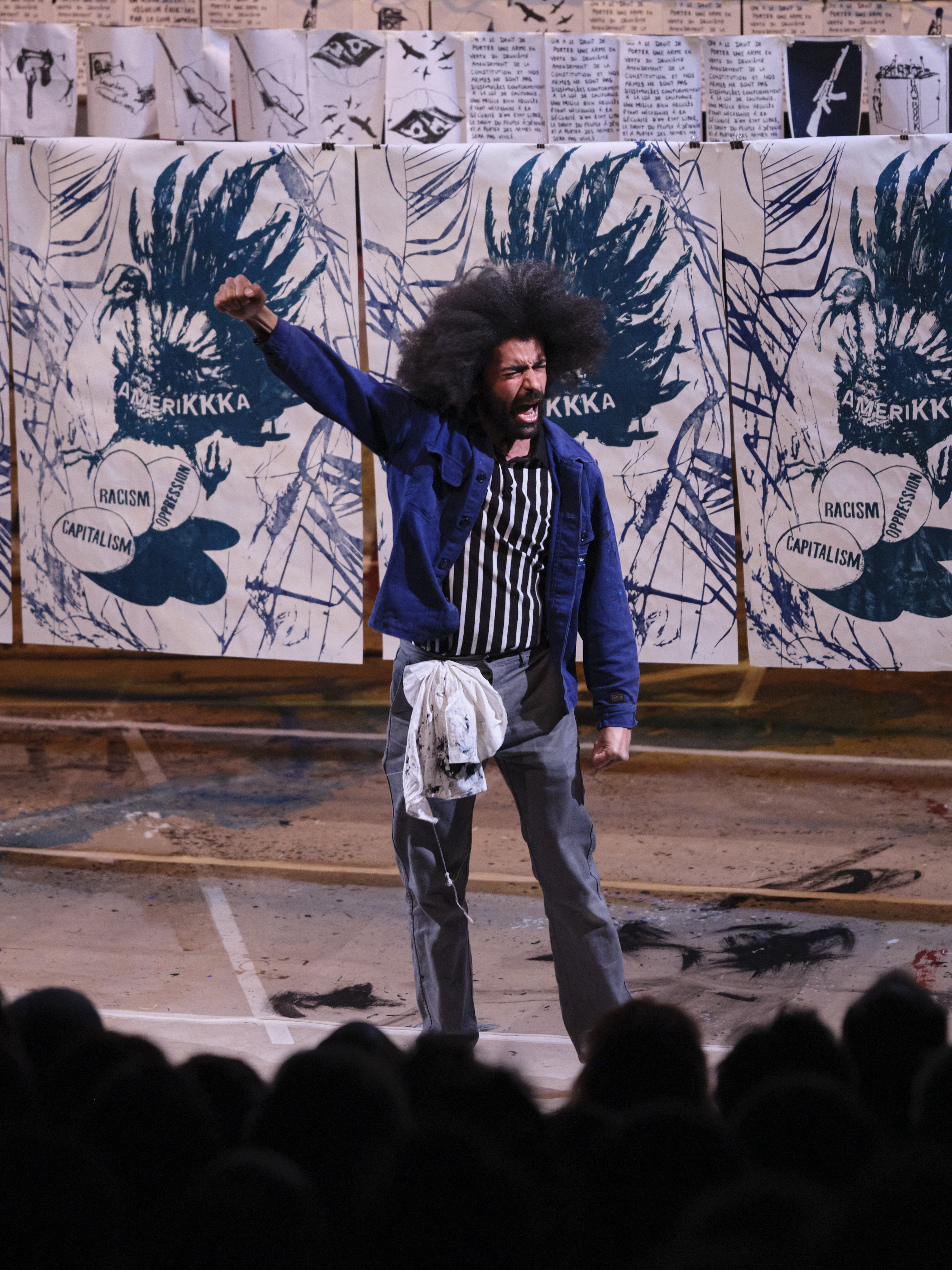 More on over or we’ll move on over you, littéralement « passez à autre chose sinon nous passerons à autre chose » nous plonge dans la salle des machines du parti, un atelier de sérigraphie imaginaire où trois Panthers inventent au fur et à mesure des modes d’actions. Le début est éblouissant de poésie, toute l’histoire des premiers colons avec quelques dessins à l’encre de chine et des silhouettes en ombre chinoise. Une dinde appelée Amerikkka couve des œufs sur lesquels on peut lire les mots : oppression, capitalisme et racisme. Carabine à roue, carabine winchester, fusil darne « Élan », colt Python, contre-enquêtes sur les meurtres racistes, pochoirs, la racle de sérigraphie produit en direct des compositions saisissantes. L’instant d’après les militants s’emploient à déconstruire leur image médiatique car ils ne sont pas là pour « bouffer du flic ». La mise en scène de Stéphanie Farison tape là où on ne l’attend pas, le happening succède aux travaux manuels, les patrouilles armées testent en direct les slogans. Si ça ne marche pas on recommence. Tout est concret car, au lieu d’attendre le grand soir, ils améliorent réellement le sort des minorités qu’ils représentent par l’éducation populaire, les cantines gratuites, l’accompagnement des familles de détenus, la lutte contre l’alcoolisme, la toxicomanie, la formation des communautés noires à l’auto-défense. On ne s’engage pas en politique le ventre vide alors ils agissent, quand les gens ont un problème ils vont voir les Panthers.