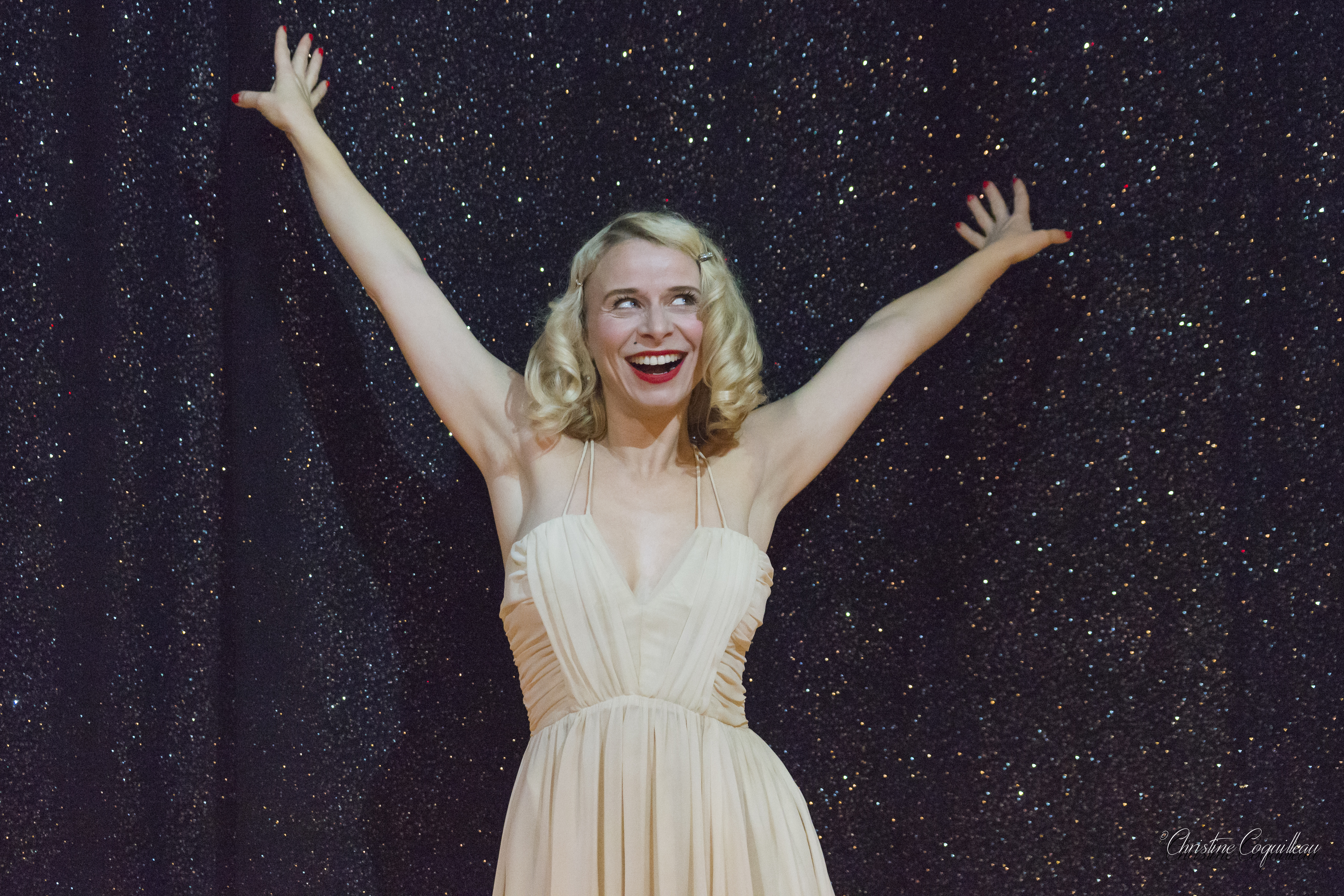 Mudith Monroevitz, la réincarnation ashkénaze de Marilyn Monroe, est, comme son titre l’indique, un objet théâtral non identifié, qui tient de l’autofiction théâtrale, du stand-up, du numéro burlesque, et de tant d’autres choses. L’actrice en scène, coiffée comme Marilyn, vêtue comme elle d’une vaporeuse robe blanche, entreprend tout d’abord de nous raconter un « date » catastrophique : le prétendant est un accident industriel, qui semble légitimement appeler un autre accident industriel, d’ordre somato-gastrique celui-ci. (La femme en effet, cet être fragile et ethéré, est aussi un ventre, un estomac, un intestin.) La débâcle psychique est propice à l’introspection psychique : que ne faut-il pas avaler pour arriver à être une femme ? Ou une comédienne – et une comédienne légitime, qui aimerait jouer La Mouette ? Mais comment Marilyn a-t-elle donc fait, elle ? Cela tombe bien : l’icône débarque un soir dans la cuisine familiale, par le tarama périmé attirée, et va pouvoir guider « Mudith » sur le chemin du devenir-femme, et du devenir-actrice.