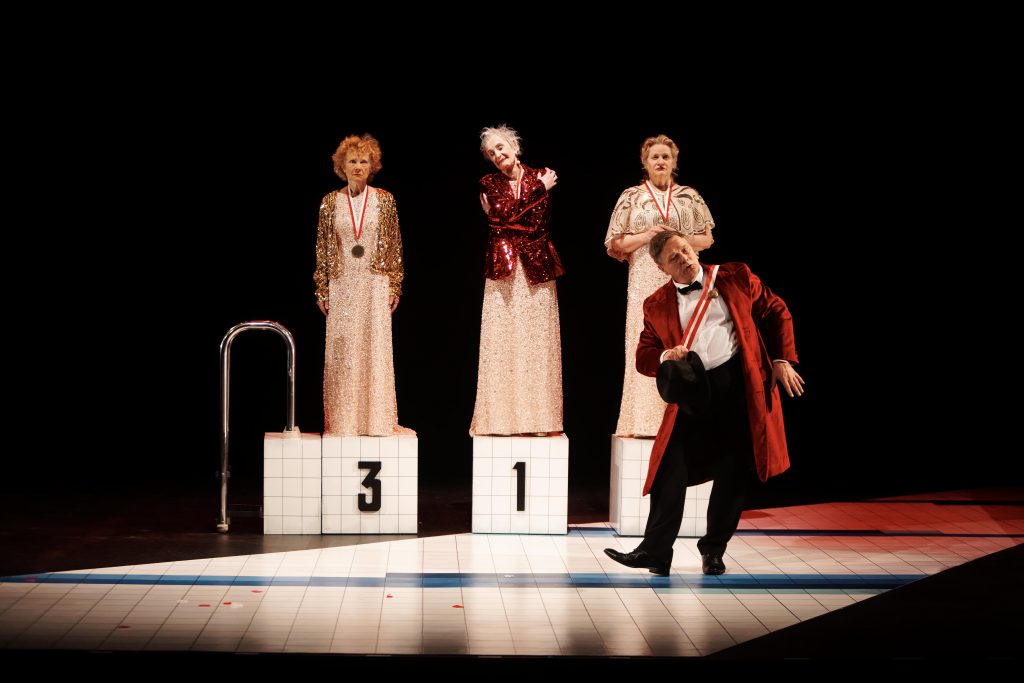 Nage libre est un moment chargé de surprises, de souvenirs et d’éclats de rire. L’humour, et la magie si l’on peut dire, sont très présents. Elles sont reçues par Monsieur Lust, directeur du Cabaret l’Enfer (crée en 1906 puis fermé en 1937, avant d’ouvrir de nouveau ses portes) et conseiller municipal, surprenant parce qu’on ne sait pas vraiment s’il est « vrai ou faux »… Le diable en personne ? Les questions se multiplient, fredonnant un allez savoir, un juste ou faux, bon ou mauvais. Nage libre est un univers surprenant avec trois vieilles dames, trois vieilles championnes de natation qui se retrouvent, en robe de soirée, pour un moment si important pour elles. Que va-t-il se passer ? Le présent, les échanges se multiplient et le passé assomme, ici ou là, fier de lui. Hannah, Rachel et Esther luttent. Vienne juste d’avant-guerre fait des longueurs, le cabaret dans lequel tout se passe est vraiment mystérieux, essence d’un hier sur lequel des images vont et viennent, victoires des nageuses, nuits folles des années trente, applaudissements, discours menaçants. Hier et aujourd’hui tout proches. Ces quatre personnages, les nageuses et ce politicien luciférien ou non, laissent penser d’abord à une comédie, pas très légère, certes, mais sans véritable force. Et très vite, les spectateurs sont emportés, touchés, sentant toute la puissance que chacun et chacunes, ces quatre, là, déposent dans Nage libre. Le souvenir d’un sujet si fort, avec cependant du rire, de la légèreté. Comment s’attendre à un tel mélange, comment s’attendre à une telle réussite ? Francine Bergé, Bernadette Le Saché, Flore Lefebvre des Noëttes et Nicolas Struve surprennent. Parfois glissent et manquent. Et alors ? Une union parfaite se ressent entre eux, la simplicité mêle passé et présent, le souvenir est là, de temps en temps en yiddish, en espagnol, en anglais ou allemand. Difficile de devoir s’en aller après les applaudissements, pas envie de quitter ce « cabaret ».