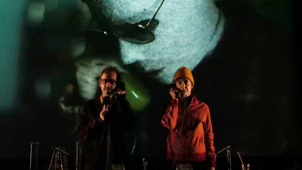 Métilde Weyergans et Samuel Hercule, accompagnés en live des musiciens multi-instrumentistes Timothée Jolly et Mathieu Ogier, se lancent dans un ballet minutieux de manipulation d’objets et de doublage en direct pour donner vie à cette histoire sur scène et à l’écran. Rempli de trouvailles ingénieuses, la mécanique prend et on s’attache autant aux personnages qu’on prend plaisir à assister aux coulisses techniques de l’élaboration de ce spectacle surprenant. Le regard parcourt la scène, s’attarde sur l’écran, s’arrête sur le système d’ingénierie à vue ; tous les sens sont en éveil et on se surprend à souhaiter voir et revoir ce spectacle pour pouvoir savourer chaque image. Tout comme les formes artistiques, décalage et osmose, humour et émotion se mélangent pour nous faire voyager au cœur des émotions traversées par les protagonistes. Les péripéties s’accumulent et on est happé par le sentiment de liberté et la tendresse qu’apporte le récit. Car Shakespeare ici s’avère presque être un prétexte, tant l’âpreté de sa dramaturgie ne noircit pas l’ambiance générale. Et même si la tragédie n’est jamais loin, la poésie et la douceur l’emportent largement.