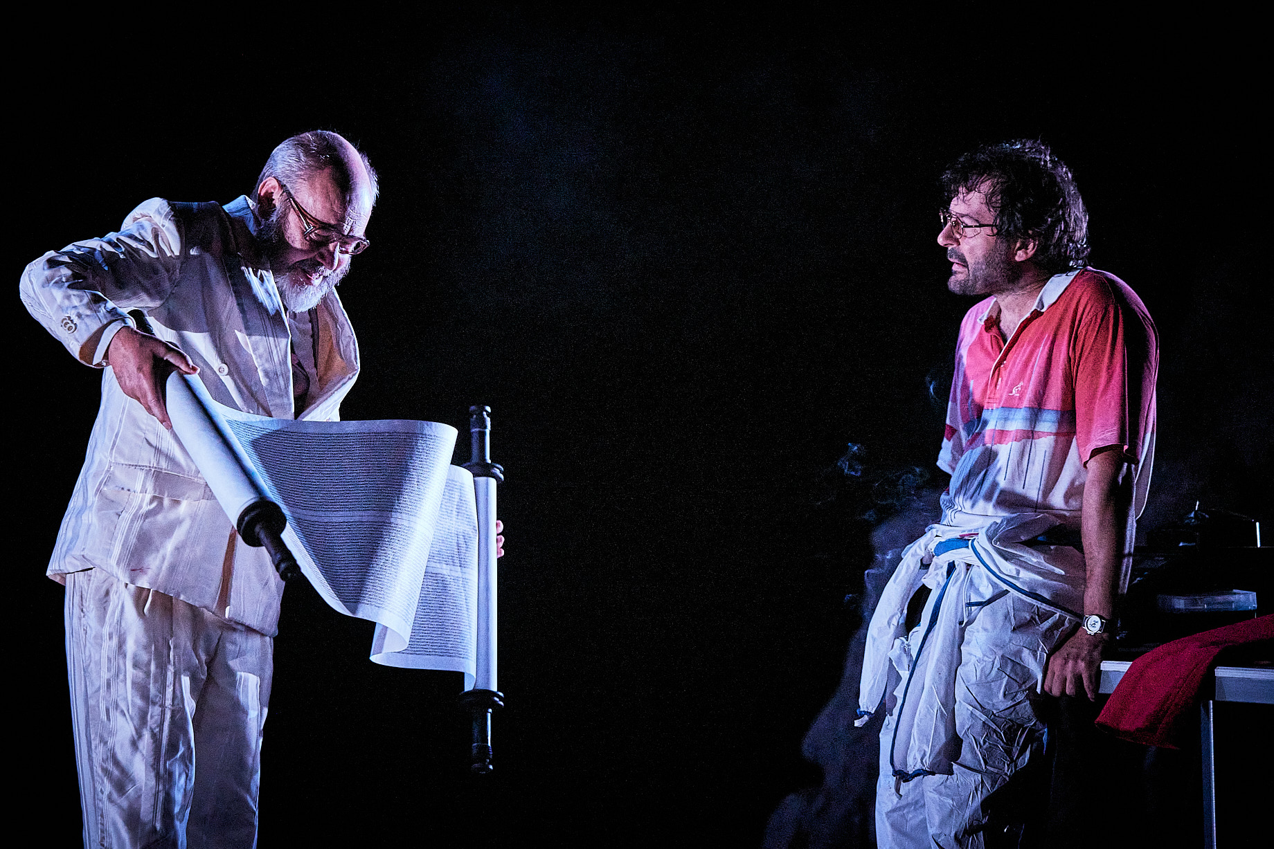 Après un prologue dans le noir complet entre deux scientifiques venus se réfugier dans un sous-sol en Californie après l’accident nucléaire de Tchernobyl et laissant cours à un dialogue et un « coup de foudre » cocasses, le spectacle se poursuit par une discussion fictive entre deux scientifiques à un symposium à Berkeley en avril 1986, partant des météorites (nos fameuses petites pierres noires) jusqu’à notre condition actuelle dotée de sens critique (truculente boutade sur la profession située au rang G), en passant par Neandertal et Homo Sapiens.