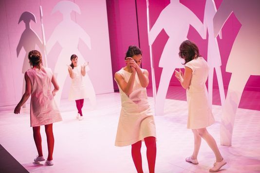 Les idées de mise en scène sont éculées, il ne reste que le jeu froid et distancié des comédiennes à nous mettre sous la dent. Les neuf petites filles sont comme posées au fond d’une boîte rose bonbon ; couleur quelque peu simpliste pour figurer le monde enfantin des petites filles…. Puis, de gros ballons couleur pastel viennent compléter le tableau glossy-glossy. Les petites filles revêtues d’une même robe blanche, ont toutes un éclat de peinture rouge carmin sur la poitrine ; c’est esthétique, mais tellement attendu… Enfin la mise en scène loin de trancher avec le texte de Sandrine Roche, l’avale complètement. La volonté de Stanislas Nordey d’être, avec ses comédiennes, au plus près et au service du texte est à saluer mais le résultat est tout autre. Des mots lancés dans le vide, des comédiennes qui ne se regardent jamais, une prise de parole qui vire au procédé technique… et même si on comprend l’intention du metteur en scène de « transformer » ses comédiennes en colonnes d’air pour laisser passer les mots et les silences, en enveloppes vides au service du texte, rien que du texte, tout devient systématique et l’on s’ennuie rapidement.