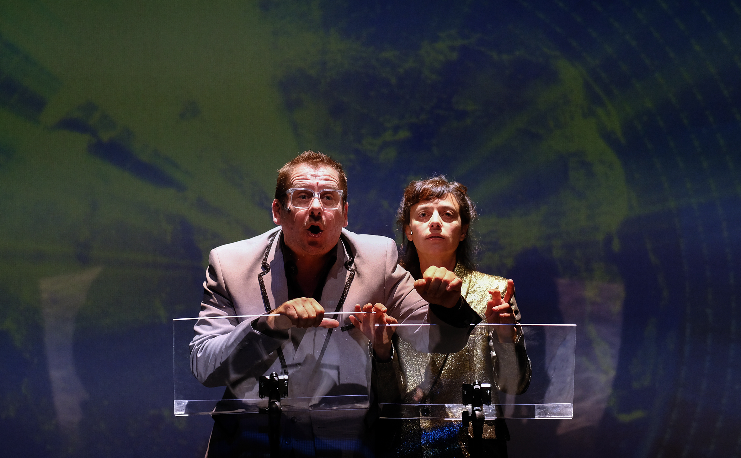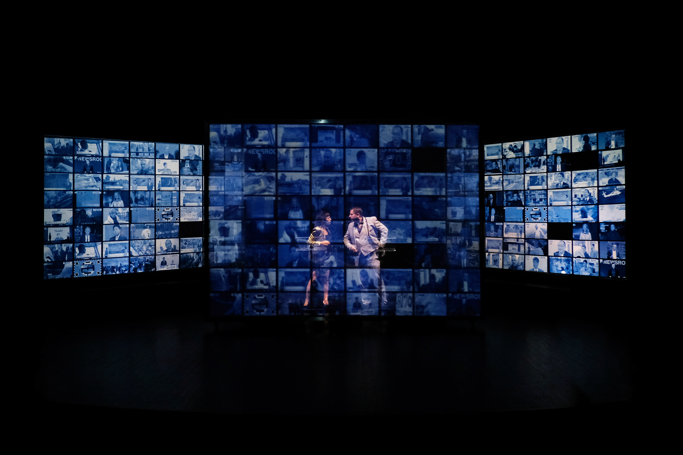 Un retable des temps modernes, voilà ce à quoi l’on pense en découvrant la scénographie de Notre Parole. Un retable immense, composé de trois panneaux vidéo déroulant leurs nappes de bruit numérique. Trois gigantesques écrans de télévision qui ne capteraient rien, sinon le bruit et la surface des choses : des pixels. Puis, tels aux premiers jours de la Création, l’indistinct, l’invisible, le chaos s’organisent, se condensent et prennent la forme d’un plateau de journal TV, animé par son habituel couple de présentateur et présentatrice.