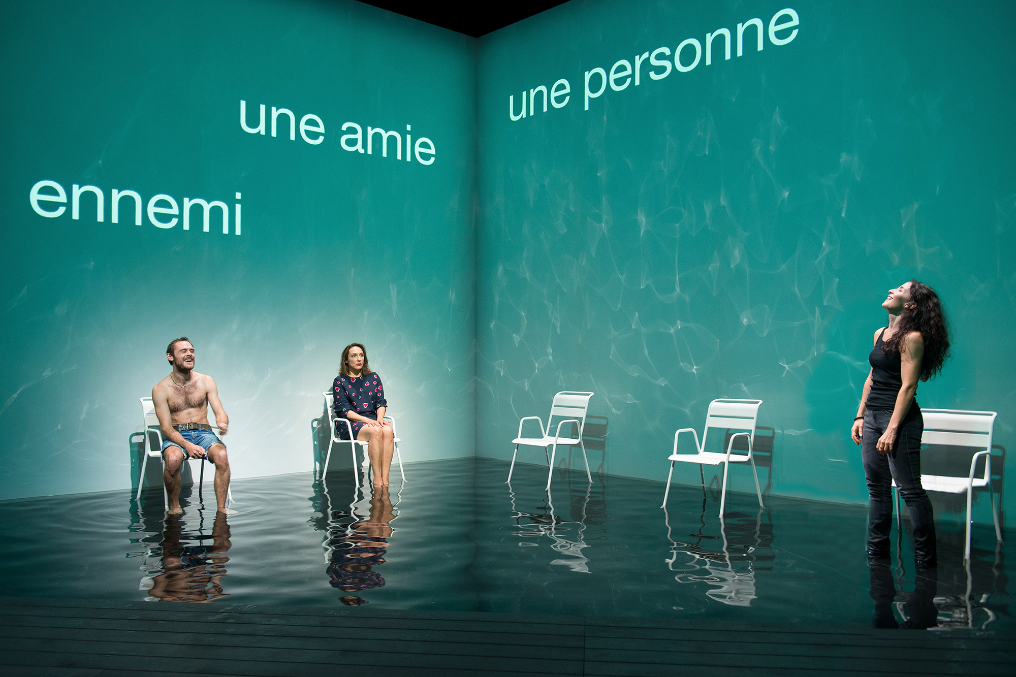 Sans doute un des spectacles les plus forts. Terrible dans son essence même, écrit par Arne Lygre, puis mis en scène, pour cette création, par Stéphane Braunschweig, comme pour nous bousculer, nous faire ouvrir les yeux, nous faire du bien et du mal. Nous pour un moment est une suite étrange de six « moments » entre deux, trois personnages, étant « ami-e-s », « ennemi-e-s », « inconnu-e-s », une « personne », etc., et qui à travers une structure très tendue et imposante racontent ce qu’ils vivent, ont vécu. Puis ils disparaissent et celui ou celle qui reste poursuit « l’odyssée » en devenant un nouveau personnage en lien avec l’un des précédents : pour ne donner qu’un exemple, une femme meurt, se noie, est morte puis se relève et devient son mari apprenant qu’elle vient de mourir. Tout se suit, se bouscule, l’amour, la mort, la honte, la colère, et surtout la solitude, toutes les questions qu’elle pose cette solitude, toujours différente, toujours la même, toujours là hélas. Tout se suit, se reflète plutôt, le sol est une immense étendue d’eau, invisible avant l’arrivée des premiers personnages, puis ensuite s’ondulant, lumière étrange ou douce sur les murs blancs, mains liquides et sauvages tentant sans cesse de récupérer, laisser fondre, dissoudre les personnages. Scénographie ahurissante. Entre chaque « propos », les cloisons se soulèvent, semblent donner enfin de la liberté, du possible, et retombent doucement, enferment. Cette eau si présente peu à peu devient invisible, simple élément de détresse en plus, simple écho.