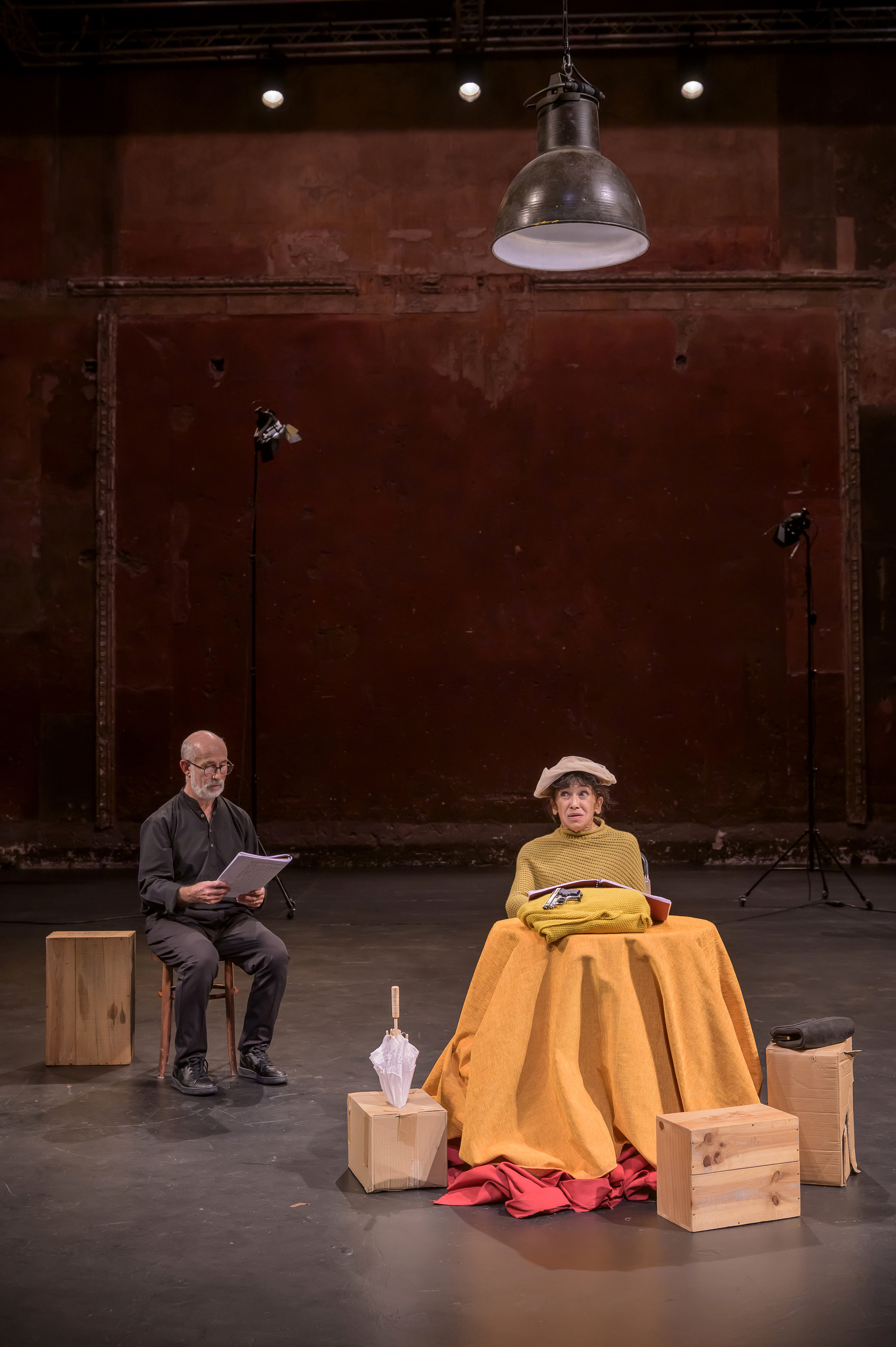 Marcello Magni, n’est pas dans le bas du décor, derrière le mamelon ou Beckett confine Willie. Sur le côté, à vue, sur un tabouret, il donne la réplique. Formidable lui aussi de présence burlesque et d’invention. Un tabouret que l’on renverse et voilà le trou de Willie. Surtout, en charge des didascalies, toujours minutieuses et importantes chez Beckett, il en fait autant de répliques, de réponses possibles au babillage de Winnie. Le leitmotiv « un temps », le silence et la temporalité qu’il induit est important dans l’œuvre mais Peter Brook − lecture oblige ou volonté délibérée − ne le respecte pas, devient une partition en soi, scandée, modulée par Marcello Magni. Willie acquiert ici une épaisseur insoupçonnée. Il devient le narrateur, personnage tout aussi central que Winnie.