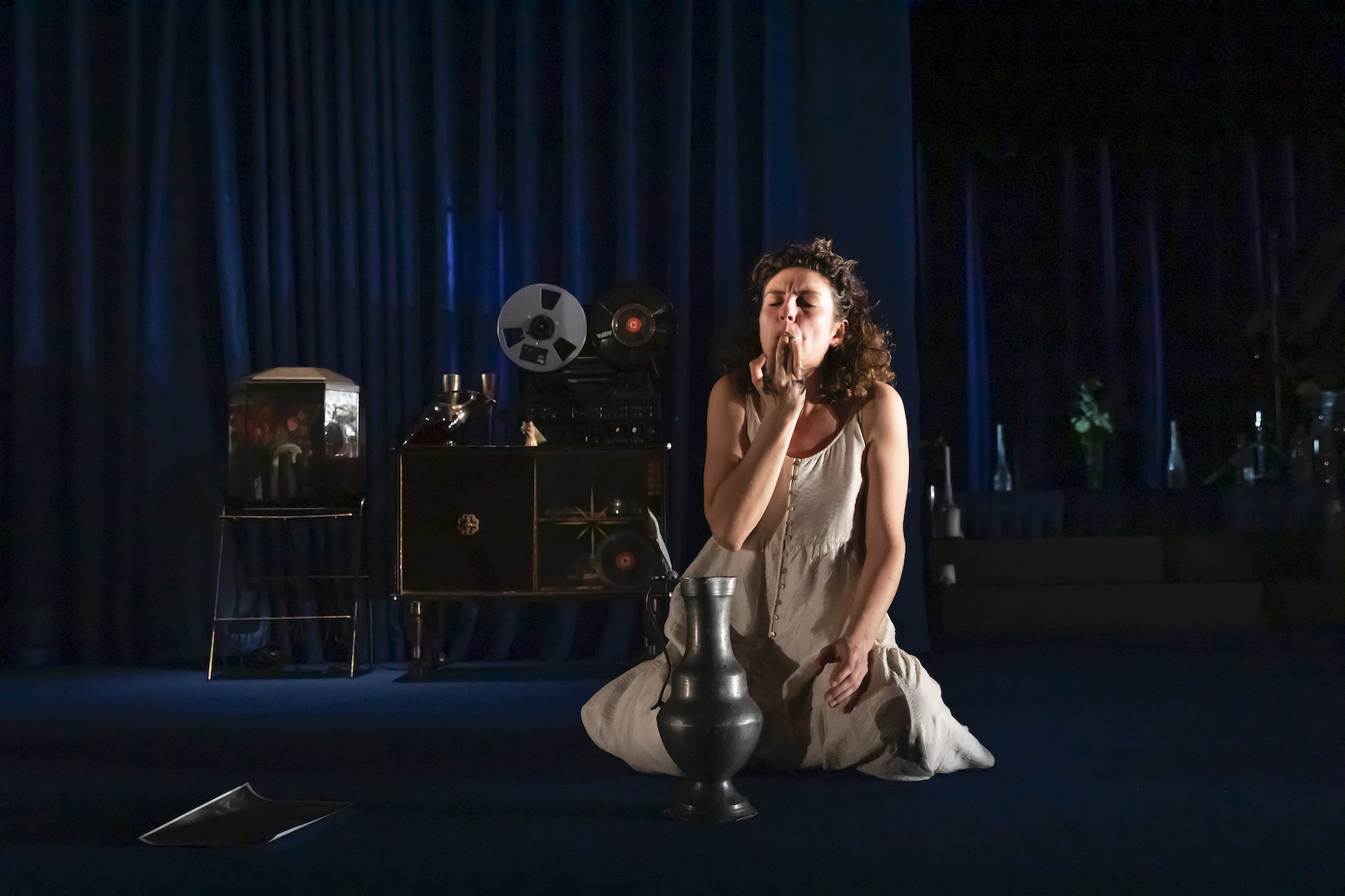 C’est dans une antichambre, entre bureau et salle d’attente, qu’Eurydice pousse son cri. Pas de hauts cris, non, mais une rage glacée, une colère sourde, une volubilité libératoire. Virgile L. Leclerc se saisit fermement de cette parole compacte et son premier mérite est de nous rendre tout ça fort intelligible. Le verbe d’Elfriede Jelinek étant fort ardu, la pensée profuse, la tâche n’était pas mince. Nul éclat de voix, au contraire, mais une certaine sérénité à déballer tout ça, vider son sac, délabyrinther non sans humour et saute d’humeur le fil d’une vie en trompe-l’œil, comme un bilan définitif, un trait que l’on tire pour passer à autre chose. Marie Fortuit met en scène cette parole singulière en prenant grand soin de ne pas l’étouffer, rien ne fait obstacle à ce qui est proféré. Virgile L. Leclerc est en cela parfaite qui ne fait nul effet de manche, sobre plus que démonstrative et ça fait mouche. Orphée est là, lui aussi, lui qui dans le récit n’était qu’évoqué. Chantant et jouant de la batterie comme on pleure un amour défunt, en habit de lumière d’un kitch parfait, il ne sort pas de là forcement grandit. Romain Dutheil est idoine qui joue cette partition avec grand naturel, sans craindre le ridicule. Les enfers sont pavés de bonnes intentions et ce lieu, en avant-scène, qui rassemble les souvenirs épars d’Eurydice, particulièrement sa garde-robe – reliques d’un passé révolu et définitivement aboli – devient ce que Virginia Woolf préconisait et que souligne Marie Fortuit, « une chambre à soi ». Là, la parole performative d’Eurydice devient poème et révélation. Cette mise en scène ne révolutionnera pas le genre malgré des qualités certaines, certes, mais son importance est ailleurs, dans cette volonté fermement affichée de déployer sans la trahir la parole acide d’Elfriede Jelinek, l’âcreté de son écriture, cette réflexion politique et poétique au vitriol sur les mécanismes de la domination masculine, indispensable aujourd’hui au regard de la tentation conservatrice.
