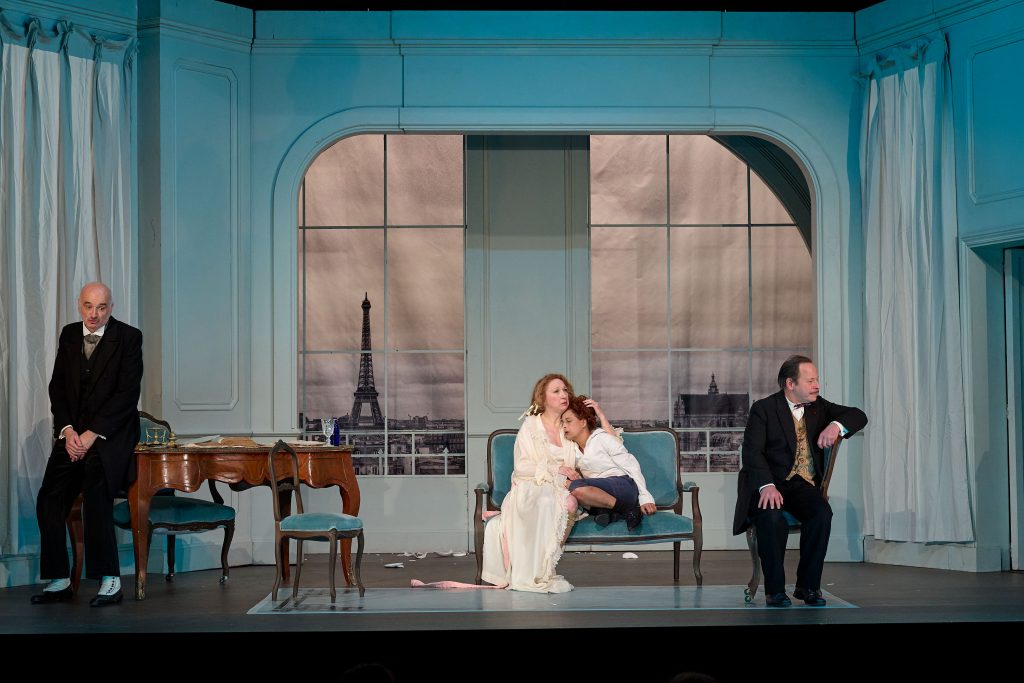 L’originalité de la mise en scène ne tient pas à celle-ci mais à ce qu’Emelyne Bayart incruste dans ce vaudeville, usage qui s’est perdu, des couplets chantés. Chansons de la même époque, drolatiques sinon poétiqueS, mais qui n’expriment rien de moins ici que l’inconscient des personnages, leur rapport fumeux au couple et à l’amour (ce qui n’est pas tout à fait la même chose, on en convient). De vraies pépites, chansons de circonstance où le fantasme d’étrangler votre moitié (au mieux) comme votre frustration dans la pratique de « la chose » s’avère un exutoire. Loin de ralentir l’action c’est au contraire une heureuse respiration bienvenue et pour qui aime ce répertoire de la belle époque un plaisir de la (re)découverte. Et le plaisir vient également que ces comédiens sont d’excellents chanteurs. On ne sait si de Emelyne Bayart ou de Madame Follavoine laquelle des deux ressemble davantage à Yvette Guilbert dans ce vaudeville déchaîné. Mais il est certain qu’Emelyne Bayard est une vraie divette. Et c’est dans une bonne humeur, sans bouder ce plaisir, que l’on ressort du théâtre et au vu de notre actualité délétère qu’il est bon de se laisser à rire sans façon.