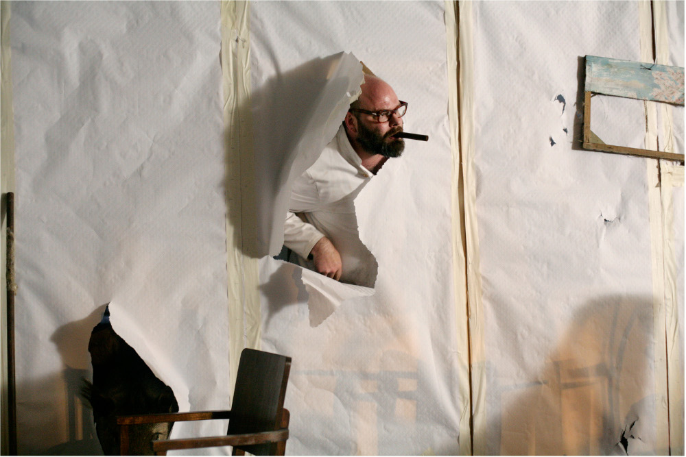 Onomatopée où comment cinq zigues déchaînés vous ravagent un plateau et le langage. Au risque de déstabiliser un tant soit peu le spectateur. Soit cinq comédiens merveilleusement complices issus de quatre compagnies flamandes et néerlandaises dont tg Stan et De Koe. Auxquelles il faut donc rajouter Dood Paard et Maatschappijj Discordia. Pour qui connaît tg Stan, cela peut sembler à un singulier pas de côté, voir un grand écart. En fait, non. C’est pousser plus loin encore le bouchon et voir s’il flotte encore. Il s’agit bien de renverser les perspectives, celles du théâtre et du langage, et d’intégrer le spectateur un peu inquiet de prime abord dans le processus de la représentation. Pour ce faire, c’est sur le plateau, le nez collé aux comédiens, que nous nous installons. Comédiens en pleine conversation où il est question de thé, de menthe et de sucre. Conversation qui frise l’absurde, où chacun suit son sujet sans jamais le lâcher, dans ce décor incongru de bar de fin du monde bricolé de bric et de broc où les objets sont hors d’usage ou boiteux et franchement inutiles. Les comédiens en garçons de café improbables, débraillés et fatigués, aux vestes cradingues, vous accueillent sans cérémonie et n’interrompent pas pour autant leur conversation. Elle se déroule, de plus en plus folle, de plus en plus absconse. « On commence quand ? » devient un leitmotiv, bientôt un gimmick qui dissimule mal une inertie patente et volontaire. De toute façon la feuille de route, l’itinéraire de ce travail collectif, déroulée mécaniquement par l’un d’entre eux, entre borborygmes et accent à couper au couteau, était proprement incompréhensible…On passe du français au néerlandais, de l’allemand à l’anglais. Les sous-titres suivent comme ils peuvent. Et nous avec. Cela vire bientôt au burlesque, au jeu de massacre. Dialogues de sourds, monologues verbeux, incompréhensions, quiproquos, engueulades sèches, réponses policées sur des sujets aussi futiles et récurrent donc que l’origine du sucre ou la quantité de menthe fraîche à ajouter dans ses tasses minuscules qu’ils tiennent aussi délicatement qu’ils broient la conversation et démantèlent le plateau. On saute du coq à l’âne allégrement tout en dézinguant joyeusement le décor déjà branlant. (Méfions-nous des perceuses, elles demandent une maîtrise aussi grande que celle de la conversation). Car c’est bien de ça dont il s’agit, mettre à nu le langage, ses tics et le toc, le foutre à poil pour qu’il n’en reste rien ou si peu. Démantibuler les mécanismes de la conversation. Bientôt on ne parle plus, on braie, on bêle, on aboie. On se tait enfin. Si peu. Cela semble complétement fou, improvisé mais c’est d’une totale maîtrise dans le n’importe-quoi. C’est totalement foutraque, ça tient du happening, de la performance dada avant de finir en mini festival de poésie mimi. Car il n’y a pas que le langage qui est mis à la question. La théâtralité aussi quand elle tient du foutage de gueule. Et c’est justement dans ce numéro d’équilibriste qu’ils montrent tout leur brio, leur maîtrise, à rester sur une crête ténue où l’on ne sait plus très bien à quoi s’en tenir entre fumisterie et folie furieuse. C’est dans ce léger décalage qu’ils offrent une brèche dans laquelle on s’engouffre à notre tour pour se laisser aller dans cet improbable foutoir, cet espace de liberté offert. C’est sûr, quelques esprits chagrins ne vont pas s’y retrouver à prendre ça au premier degré. Qu’on ne s’arrête pas à la forme, aussi superbement libre et foutraque semble-t-elle, le rire qui résonne dans la salle n’est pas dupe de ce qui se joue réellement. Il y est aussi question de solitude et d’incompréhension. Les belges sont un peu triste aussi, parfois. Mais il est rare, et bon, que des comédiens s’octroient une telle liberté sans renoncer à leur savoir-faire. Alors oui, ce bœuf faussement improvisé, véritablement et furieusement hilarant, est à découvrir, ne serait-ce que pour son véritable propos, révolutionnaire, résumé sur le calicot qui surplombe le décor : « Le geste spontané a disparu de la sphère néolibérale que actuellement la société est (bon gré mal gré) devenue à l’heure actuelle ».