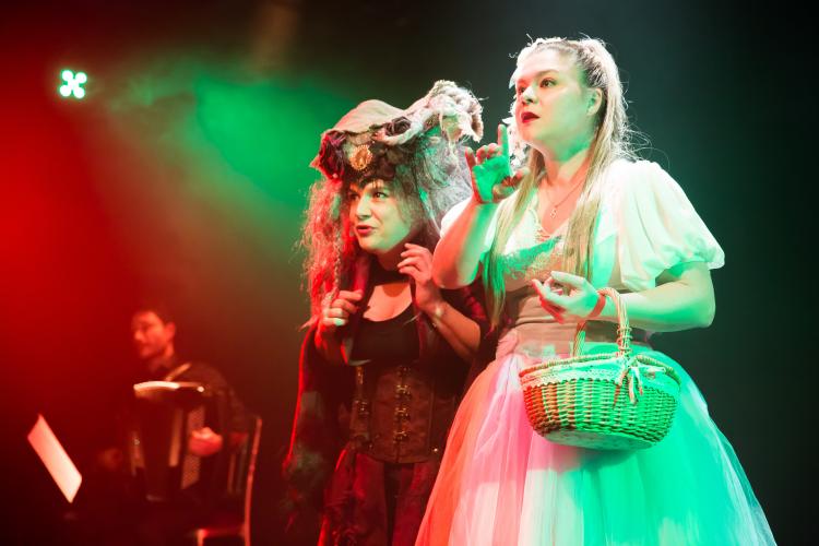 Machine à fumée, miroir de loge et lumières qui claquent, on est dans la fantaisie de cabaret, dans un vrai terrain de jeu pour chanteuses-comédiennes. La direction musicale est précise et l’accordéon parvient à jouer pour nous, tous les instruments, sachant se faire à la fois discret et polyvalent. Les interprètes s’éclatent, ça se voit jusque sur leurs têtes, elles prennent un plaisir fou à grossir le trait de la cantatrice. Une vilaine sorcière, une jeune première et des amoureux se succèdent et l’on a parfois l’impression de voir deux gamines farfouiller dans les déguisements au grenier. Peut-être que c’est elles qui ont tout compris : la scène est là pour s’amuser, pour tout inventer, pour tout mimer, pour tout grossir. Mais avec classe.