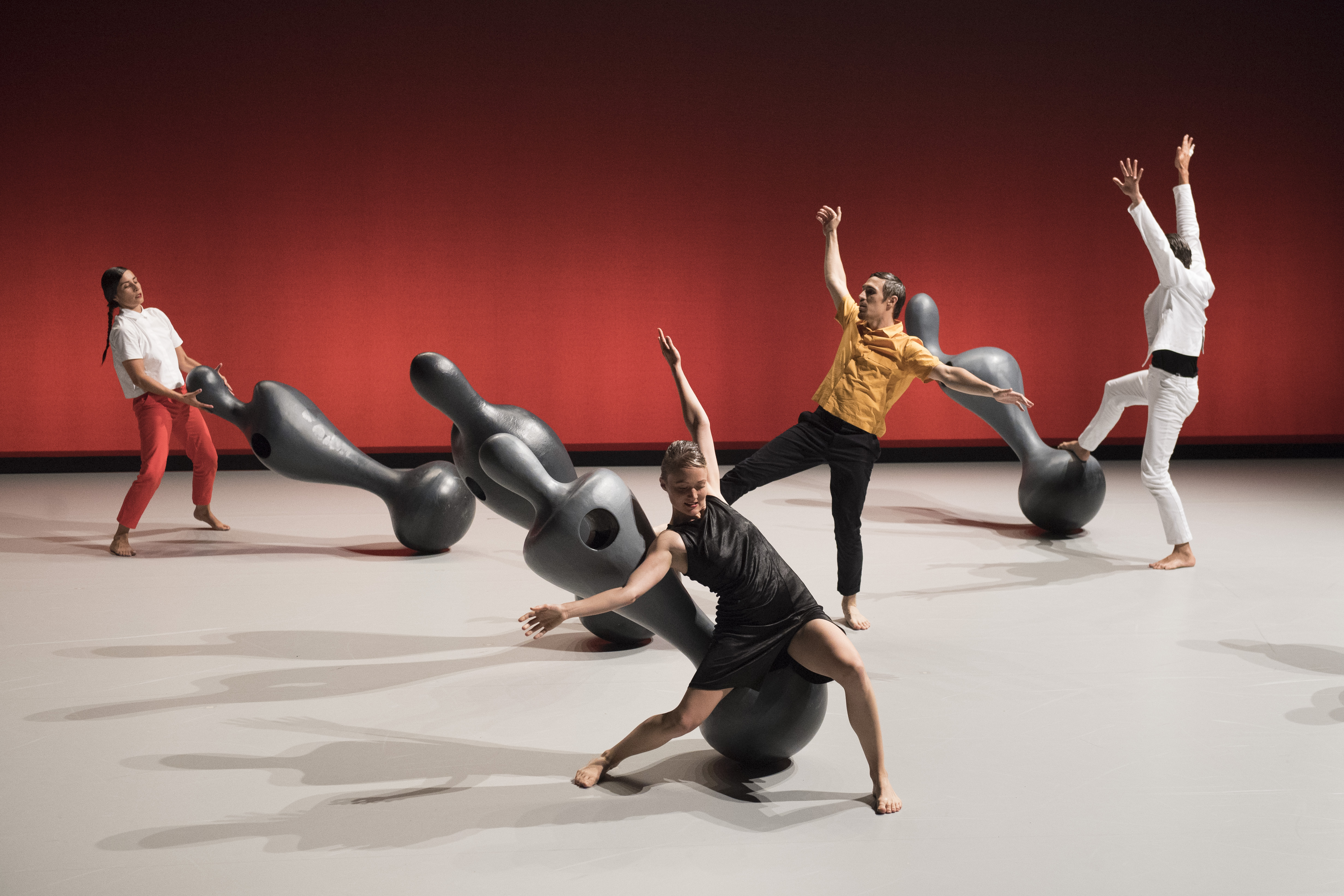 Le titre paraît un peu facile, léger. On se dit que oui, Hans Arp est avalé ici, pris pour faire bien, idées de sculptures pour idées de danses. Les points d’interrogations, positifs toutefois, valses d’impatience. Et en fait le talent, l’émotion sont là, très vite pour ne pas dire tout de suite. Il est là, sur scène avec les oscyls, étranges souvenirs arpiens, et avec trois femmes, quatre hommes. La magie apparaît, lente silencieuse, une femme apporte cette lenteur, suivie d’une de ces sculptures à taille humaine et avec lesquelles vont naître les mouvements, sentiments, ressentiments, jusqu’aux vibrations particulières pourquoi pas ?