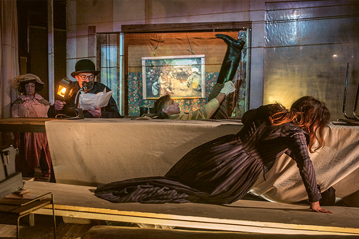 Les acteurs cheminant, chevauchant, des textes nerveux de Walser, Kafka, Kierkegaard, Kleist, Tchekhov, Shakespeare, Dostoïevski, sont eux-mêmes sur une ligne de crête, les corps ballotés par des vents contraires, miraculeux d’équilibre entre gravité et burlesque. Cette pièce, la dernière mise en scène par François Tanguy, brille de la facétie poétique d’un Max Jacob, voire celle des Marx Brothers. Dans cet art de l’ironie existentielle où le retrait est le rehaut du jeu (je), les acteurs sont pareils à de vibrants mats portant haut leurs figures littéraires, comme des voiles au vent. Ils les tiennent en respect, ces personnages pareils à des oriflammes faisant signe dans la tempête. Jamais ils ne se perdent de vue. Leurs gestes, leurs moulinets, leurs gonflements, comme ces mots, prenant acte, qui dépassent la pensée, la défont.