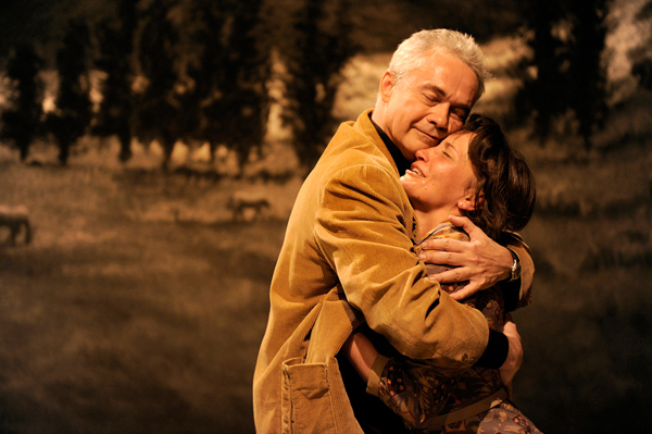 Les deux nouvelles adaptées par Jacques Lassalle parlent du couple. Dans « Intimité », un homme qui a quitté sa femme tente maladroitement, après quatre ans d’absence, de la retrouver. La scène s’ouvre sur un petit air de country, Ricky Nelson chante Mary Lou. Lui est écrivain, manifestement à l’orée de sa carrière, elle, on ne sait pas ce qu’elle fait, mais on comprend qu’elle est restée dans l’ombre alors que son ancien compagnon rencontrait ses premiers succès et qu’elle a très mal vécu la rupture. Il ne s’était pas rendu compte de sa détresse, il lui demande si elle a reçu ses livres et ses interview, si elle les as lus. Elle explose, lui en veut terriblement, toutes ses vielles rancœurs remontent d’un coup. « T’es une ordure, un vrai fils de pute, sans cœur et sans pitié ». La scène se passe dans la salle à manger, un matin d’automne ; au milieu de la pièce, une table en bois et deux bancs. Elle vide son sac, longtemps elle est restée inconsolable. Inconsolable, le mot le plus triste du monde. Il ne dit rien mais finalement c’est lui qui s’agrippe au bas de sa robe, avec la ténacité d’un fox-terrier alors qu’elle lui demande de partir car son mari va rentrer. « C’est pour ça que tu es venue, pour être pardonné, je te pardonne, tu es heureux ? ».
