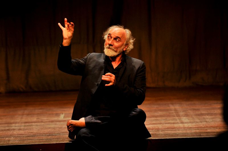 L’homme est volubile, passionné, sincère. Son débit tourbillonnant fait un petit détour en Inde, passe par le N. York des années 60/70, le living, Grotowski. Il soliloque sur le long chemin de la répétition, sur la nécessité d’expulser l’ennemi intérieur pour s’oublier, faire le vide, pour qu’alors le personnage puisse jaillir. Il rappelle de garder la porte de l’enfance ouverte. Il avoue les questions parfois vertigineuses, si souvent inutiles, qui peuvent mener au bord de la rupture.