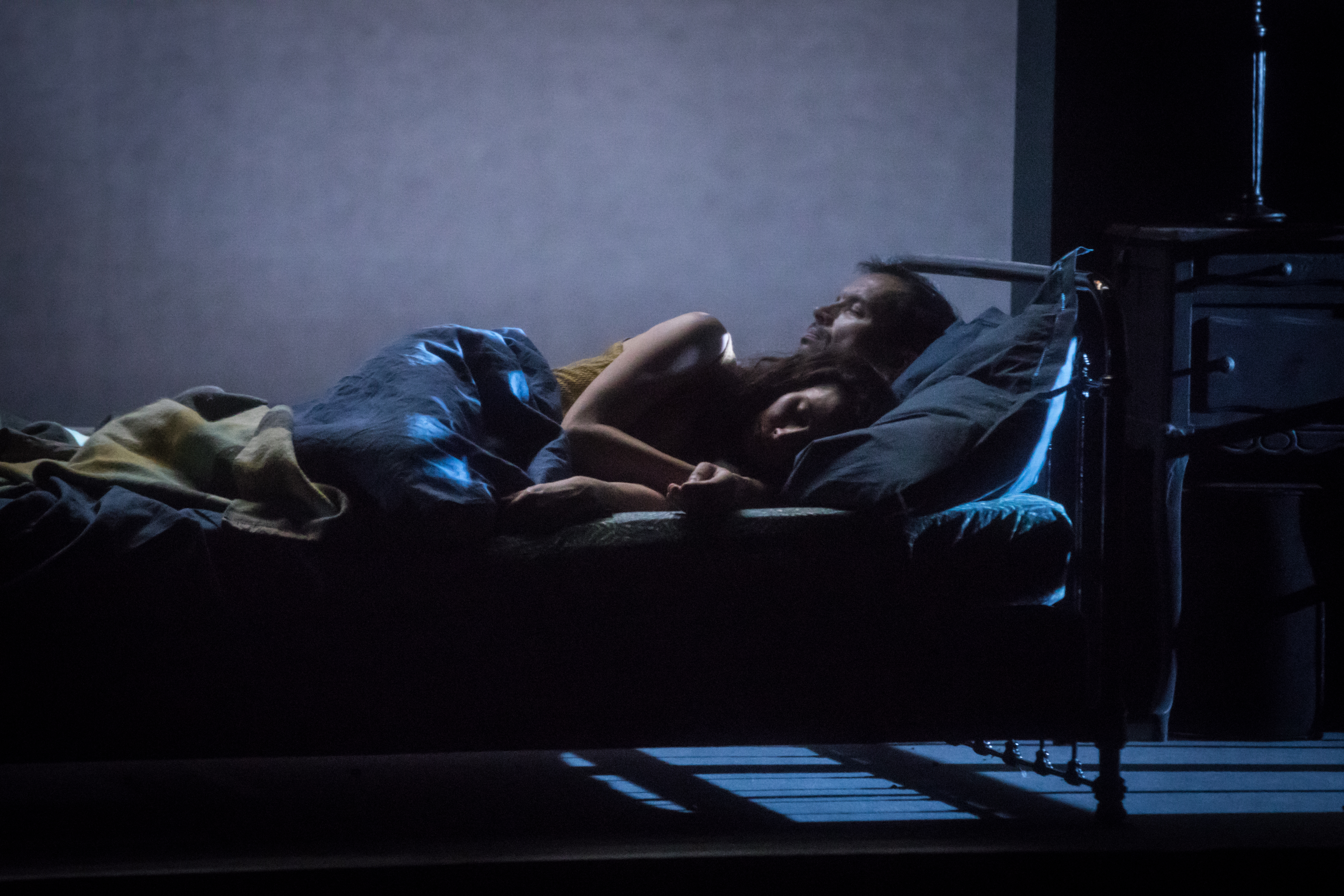 Julie Duclos fait table rase du folklore. Elle dépouille l’œuvre de toute référence temporelle, se gardant également et avec justesse de toute abstraction. Très belle scénographie, un château réduit à deux étages, deux pièces mobiles et dépouillées, la nudité du plateau parfois en avant-scène, des images vidéos pour la forêt, la mer et la grotte, en direct pour des plans serrés traquant l’imperceptible mouvement des âmes tourmentées… Le tout baigne dans un clair-obscur, parfois même l’obscurité absorbant les êtres en proie soudain à la panique. Julie Duclos impose aussi le silence, le vide, n’offrant alors aucune explication, juste la nudité des sentiments écorchés, frottés au sel d’une passion condamnée. Les acteurs expriment, quand ils les expriment, leurs sentiments à bas-bruit, à peine osent-ils affirmer les tumultes qui les déchirent… Tous sentiments irrépressibles semblent contenus, tout élan bridé, brisé. Julie Duclos épure avec cette volonté claire et affirmée de représenter non l’avers mais l’envers de cette pièce, de mettre en lumière la source souterraine qui irrigue cette œuvre, les liens ténus, les rhizomes secrets qui relient chacun des personnages, inconnus parfois d’eux-mêmes. Seulement voilà, à tant réfréner tout envol, à contrôler avec minutie tout état d’âme et leur échappée, tout affect jusque dans la diction (effet amplifié malheureusement par l’usage du micro, déréalisant les voix), une diction sans relief, ou si peu, à ne rien vouloir laisser paraître pour faire entendre le silence et ce qu’il porte de révélation et de mystère, peu à peu l’ennui menace, sourd et finit inexorablement par ronger l’ensemble. C’est une belle création, c’est vrai, mais si maîtrisée qu’elle en devient glaciale et manque au final de ce que Maeterlinck appelait de ces vœux, cette part d’humanité et de magie au sein de notre « tragique quotidien » et que révèle ou recèle le mystère de toute vie.