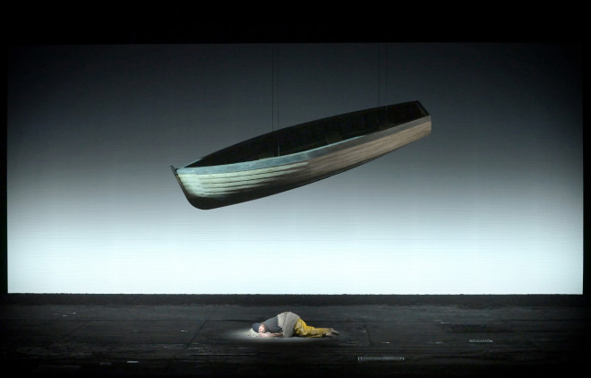 Tragédie maritime, le plateau est un quai jonché de détritus, de cordages qui contrastent avec l’arrière-plan blanchi sous la ligne d’horizon de l’océan. La mer bleuie de froid et noircie d’encre, selon les lumières de Peter Mumford, respire lourdement sous la houle musicale qui s’écoule lentement, se joue de l’ombre claire ravélienne et avale les jeunes mousses qui s’y aventurent. Cordes et flûtes symbolisent le flux et le reflux des vagues dans certains intermèdes à la Debussy, cuivres et archets surfent sur la marée, écumant d’embruns qui nous prennent à la gorge. On entend même les mouettes pêcher et se répondre au son de la flûte et d’une clarinette.