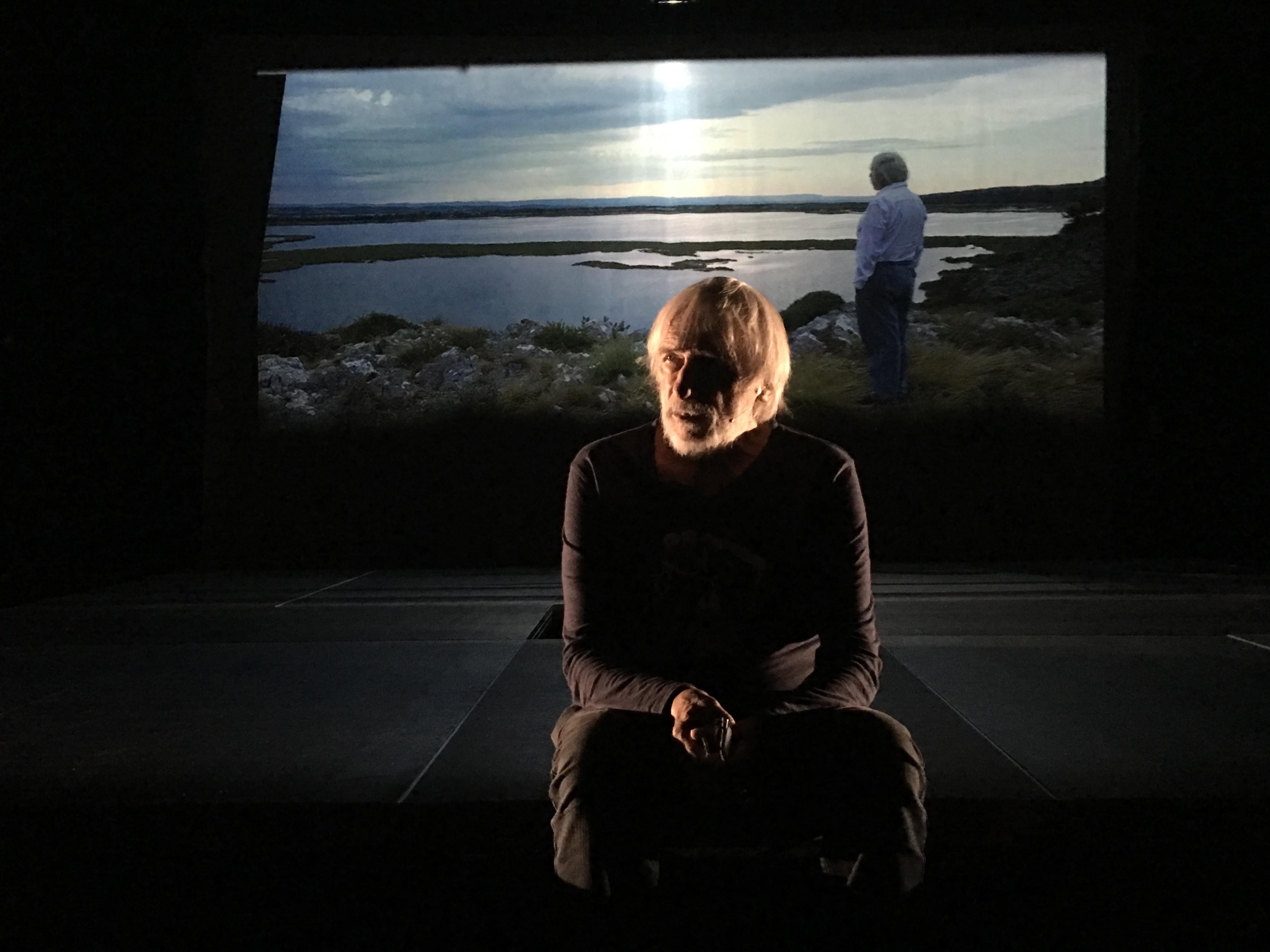 Petit éloge de la nuit, une heure cinq qui attire, un texte d’Ingrid Astier, lâchant les polars ici pour rester dans la nuit, d’une autre façon avec un homme, joué par Pierre Richard, qui se lance et s’ouvre dans les premiers méandres nocturnes, pour nous offrir ses goûts, souvenirs, désirs, un homme qui parle, raconte, partage et caresse. Belles idées tentantes. Et tout de suite on est pris pas une scénographie simple et séduisante, une scène sur scène, avec un centre carré, creux, offrant apparition et disparition de cet homme étrange, sympathique, rêveur. Et, toile de fond, un écran pur, évasions chimériques, océanes, de ce personnage singulier, avec ici où là images sibyllines, comme cette femme évoluant dans l’ombre, la merveilleuse Marie-Agnès Gillot.