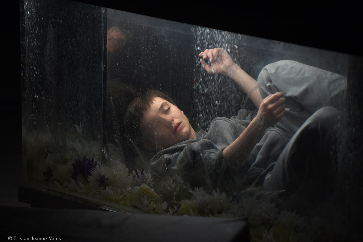 La chambre d’Eyolf, immense cube transparent, fourmillant de jouets et de masques, fait écho à l’aquarium trônant dans le salon ; c’est d’ailleurs dans cette prison de verre que Julie Berès met en scène la noyade de l’enfant ; image poignante de trombes d’eau qui se déversent sur Eyolf emmuré. Par la suite un requin-ballon télécommandé fait irruption dans le salon, traverse la scène, envahit l’espace ; la maison toute entière devient espace clos, habitée par les membres suffocants de la famille, cherchant désespérément une issue pour reprendre souffle. Pour accompagner cette noyade physique et psychologique, Stéphane Gibert, créateur sonore fait résonner les gouttes, les écoulements d’eau qui s’infiltrent dans les murs.