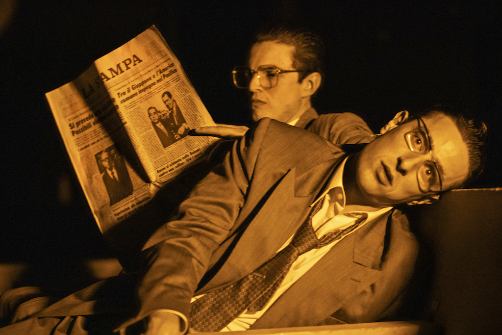 Progressivement on mesure la folie de Sylvain Creuzevault. Adapter Petrolio de Pasolini ? Autant s’attaquer à Rimbaud, imaginez le Bateau ivre sur scène ! Magma de notes croulant sous les mythes, les visions, les coïncidences et les mystères, le roman inachevé a été retrouvé en 1975 après que l’auteur ait été assassiné sur un terrain vague de Rome, dans des circonstances qu’on n’a jamais vraiment élucidées.  L’œuvre trouée, codée, cryptée est à la fois ancrée dans l’Italie des années soixante et soixante-dix, et dans la Bible, la psychanalyse, Dante et Sade. Elle se présente sous forme d’une enquête policière, qui viserait non pas tant à trouver les coupables qu’à découvrir leurs mobiles. La pseudo enquête de Pasolini sur le meurtre du patron du consortium pétrolier ENI en 1962 met en lumière les liens entre la Démocratie Chrétienne, les groupuscules extrémistes, les multinationales de la chimie, et les dirigeants des pays pétroliers. Elle tisse une cartographie de forces occultes qui manipulent la société et détiennent le pouvoir réel. On a l’impression que l’auteur veut écrire le livre des livres, tout brasser, tout embrasser du monde extérieur et intérieur, jeter son corps tout entier dans la lutte politique et la sexualité car Pétrole est aussi l’histoire d’un homme divisé en deux, Carlo Valetti, (Sebastien Lefevre), tandis qu’une partie de lui gravit les échelons du pouvoir, l’autre se fait enculer sur des terrains vagues par des ouvriers prostitués. Atroce vérité, la démocratie chrétienne, vendue aux multinationales, enfante le fasciste selon Pasolini et nous rend tous schizoïdes, à l’image du président Schreber, célèbre cas du docteur Freud que Pasolini avait lu.