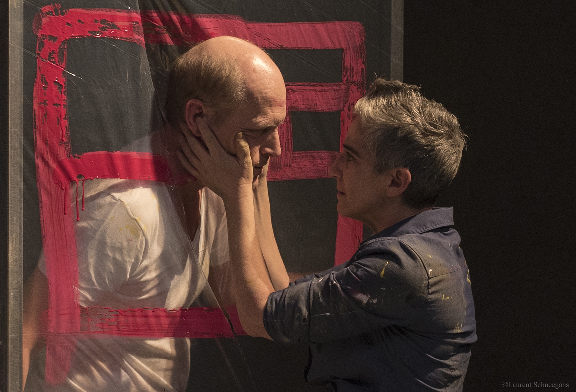 Pollock se déroule dans l’atelier du peintre, son studio est jonché de traces et de pots de peinture, une musique jazz égrène ses notes dès l’arrivée des spectateurs dans la salle. Le metteur en scène Paul Deveaux n’a pas cédé à la facilité en choisissant de ne pas projeter des images des tableaux du peintre, ou plutôt des peintres, mais en faisant interagir constamment les deux comédiens avec des pinceaux et de la peinture sur des panneaux en verre, pour mieux théoriser ou analyser l’acte créatif. Les fluides de couleurs sont projetés sur le sol selon la technique (qui n’en est évidemment pas une sur le plan académique) qui caractérisa Pollock, mais ils servent aussi à figurer une omelette dans un bol que Lee prépare pour Jackson entre deux gorgées d’alcool.