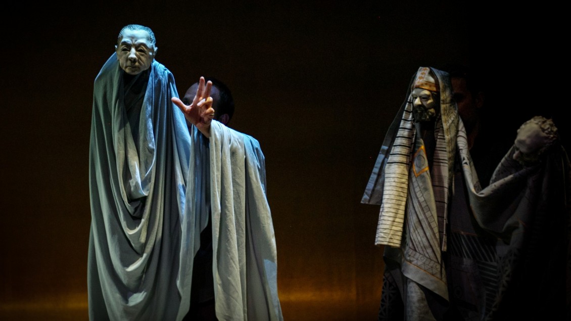On se laisse plus que prendre par cette véritable œuvre d’art de Xavier Marchand. Les marionnettes partagent le terrain avec leurs « porteurs », et avec celles et ceux, tout à faits contemporains, qui viennent raconter l’histoire, préciser les tensions et les errances, les peurs, les doutes de Ponce Pilate, les rêves de sa femme, les cris de la rue. La simplicité est pure jusqu’aux décors, blocs simples qui deviennent palais, jardins ou prisons. Les épisodes sont ponctués par un rideau de la même couleur qui marque de mini pauses, permettent aux marionnettes de se repoudrer le nez pour revenir vers nous encore plus fortes et encore plus vraies, même si elles ne sont quasi rien, juste ces masques réalisés par Paolo Duarte, de l’art contemporain, vraiment, qui pousserait au vol pour continuer les discussions avec Mardouk, le soir, dans son palais aux lucioles. Du talent partout. On ressort de là amusés, avec l’envie de lire ou relire Roger Caillois, et surtout séduits par cette poésie historique, par cette beauté calme portée par autant de talents réunis sur un même plateau.