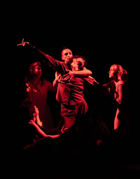 Le rideau s’ouvre sur neuf danseurs, ou plutôt sur huit danseurs et une femme plus âgée, figure de mère, d’ancêtre, de racine, de fantôme peut-être. Chacun à leur place, ils déploient d’abord leur corps dans des gestes saccadés, débridés, qui se répondent en écho ou s’autonomisent totalement. Comme dans n’importe quelle fratrie, les membres ne se ressemblent pas tous ; ils ont des corps, des langues, des styles vestimentaires et chorégraphiques différents. Mais comme dans n’importe quelle fratrie, une énergie leur est commune, et des liens invisibles, d’amour, de violence, de jalousie, de réconfort, d’entraide existent et sous-tendent les relations.