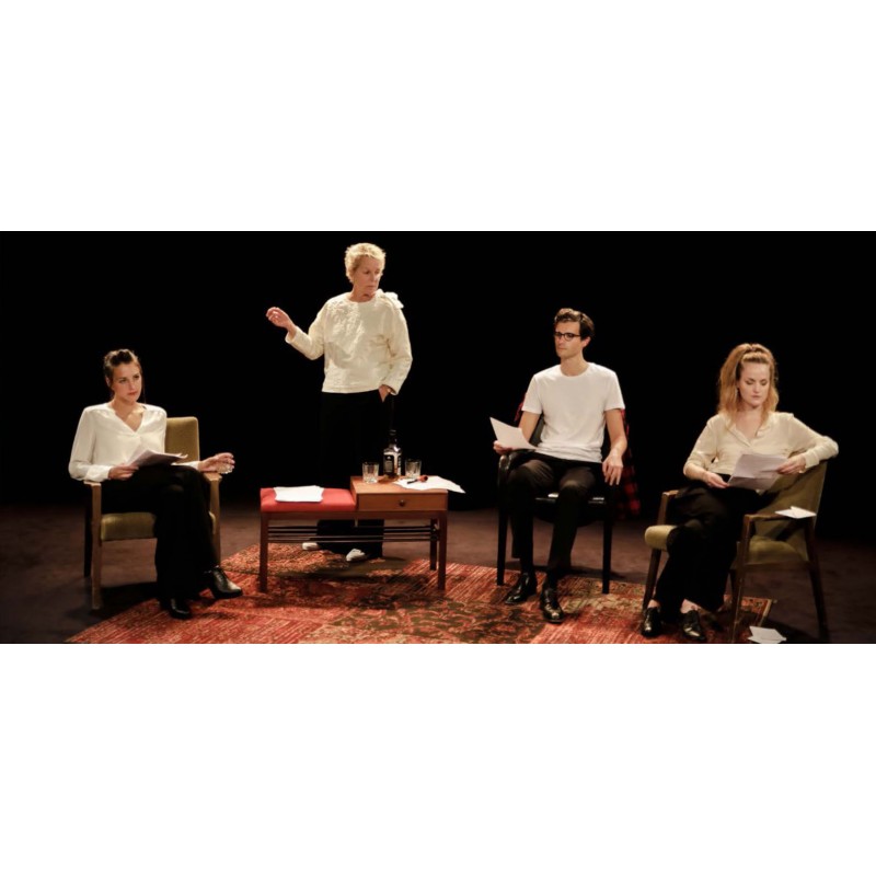 C’est Anne-Marie Philipe qui mène la danse : elle a mis en scène le spectacle, et se fait le guide du public, resituant la chronologie (la pièce commence en 1939, quand Bost, puis Sartre, vont être confrontés à la guerre, et se termine à la rupture avec Algren), évoquant brièvement la biographie de tel ou tel personnage. Le dispositif scénique qu’elle a adopté est minimaliste – quatre fauteuils, un peu de whisky, une pipe et des lunettes pour Sartre, une chemise à carreaux pour Algren – pas de turban pour Simone. Tout est fait pour mettre en valeur les textes ; les personnages sont incarnés tour à tour par Anne-Marie Philipe et trois jeunes comédiens, la pièce est clairement scindée en deux parties – la France/les Etats-Unis, autour d’un avant-après Algren – dont on nous rappelle bien qu’elle emporte l’anneau dans sa tombe, tombe qu’elle partage avec Sartre, tandis que le fidèle Bost veillera sur leur héritage intellectuel. Les lettres choisies permettent de lire un trajet sentimental qui se déroule à travers l’histoire du siècle. Elles sont à la fois pleines d’esprit, de tendresse, de joie, de douleur, et… d’amour.