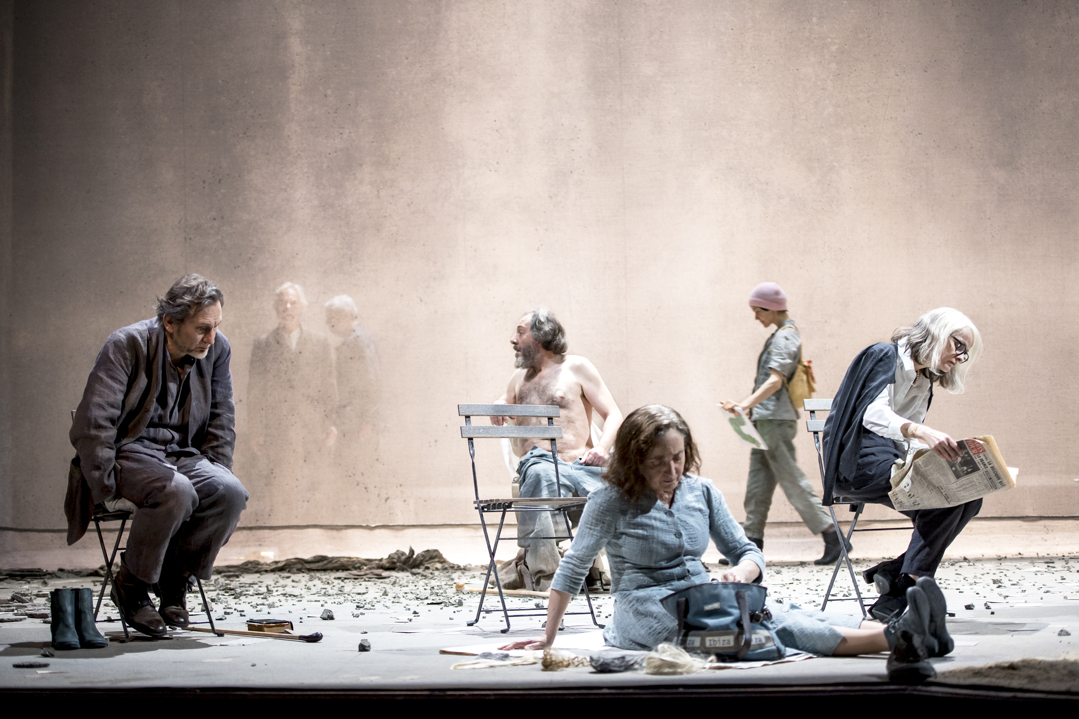 Le crépuscule des vieux. Voilà plus de trente ans qu’ils reviennent là, dans cet endroit au milieu de nulle part, en bord de mer. Vieux touristes, vieux curistes, pauvres gens qui n’ont pas les moyens d’aller ailleurs. Réunis là, assis sur leurs chaises aussi déglinguées qu’eux, à scruter le crépuscule sur la mer, à raconter leur vie, leurs morts. Ces morts qui les hantent et la mort qui vient. Le temps ici s’est arrêté, le présent se vit à l’aune du passé, le futur n’est jamais évoqué. Depuis combien de temps sont-ils là, à vrai dire eux même n’en savent rien. Le présent est aboli, c’est le temps de la mémoire. Chacun remonte ainsi le fil de sa vie, fragments par fragments. Dire avant que de mourir ce qui fut, la vérité sans doute, enfin, sans fard. Et bientôt chacun de disparaître sans que nul ne s’étonne. Revenir à la poussière. Hanter à leur tour la mémoire de ceux qui restent. Poussière, formidable pièce de Lars Norén qui en assure lui-même la mise en scène. Cartographie intime de la vieillesse, de son naufrage, de son drame. Lars Norén n’élude rien. Ce ne sont pas de glorieux vieillards. Ils n’ont rien de héros tragiques. Humbles, ils se sont perdus dans une vie bien trop grande pour eux. Là, sur cette grève, ils ont froids, ils ont faim, ils sont perdus, ils se battent, ils s’insultent, ils ne s’écoutent plus ou pas vraiment, ils râlent, ils agonisent doucement, séniles qui retournent à l’enfance. Ils parlent de la mort, beaucoup, dans l’espoir d’apprivoiser la leur. Ils meurent enfin, sans gloire, comme ils ont vécus. Tout ça est d’une mélancolie poignante, d’une vérité crue, d’une poésie réaliste qui vous empoigne sèchement. Mais ce qui transparaît c’est la vie, aussi moche soit-elle, qui innerve chacun des personnages. Des restes, des fragments d’une existence que n’occulte pas le discours sur la mort. Les comédiens, tous remarquables, ont dans leur partition délicate ménagé des silences, des regards bientôt brouillés dans lesquels se lovent précieusement cette vie à laquelle ils s’accrochent encore, malgré tout et malgré eux… Dévoilée abruptement comme par effraction, échappée, cette vie-là, comme un cœur-battant, est bouleversante. En creux elle s’immisce malgré tout et ne fait pas tout à fait renoncer. Et donne son rythme à la représentation. Un monde flottant où le temps semble comme aboli, suspendu. Le temps de la représentation lui-même s’efface et plonge le spectateur dans un entre-deux étrange. Aussi étrange que cette scénographie, cet espace quasi vide, ensablé, encadré à jardin et cour de hauts murs, ouvrant au lointain sur un mystère, l’au-delà qu’ils franchiront bientôt. Il faut accepter ce rythme-là, singulier, ralenti, qui parfois, brièvement, s’affole avant que de s’essouffler épousant ainsi la pulsation cardiaque et chaotique, intime, de ces vieillards qui ne renoncent pas tout à fait, pas encore. Il faut entendre ces silences bavards de taiseux que plus personne n’écoute. Lars Norén a ciselé chacun des personnages. Les acteurs leur ont donné une compassion sans réserve et sans aménité dans une mise à nue sans pudeur mais toute de délicatesse rêche. Ces vieillards, même lâches, même irascibles, devant la mort présente, s’ils n’ont pas de grandeur, ont une déchirante et dramatique humanité. Ils ne contrefont pas la vieillesse, ils ne la jouent pas mais la projettent dans un espace mental personnel qui envahit le plateau et la salle. Un travail minimaliste, minutieux, fait de gestes anodins et quotidiens, parfois incongrus, autant de signatures individuelles qui ouvrent sur les mystères d’une vie, son essence, qui de fait vous explosent à la figure en une déflagration violente au soir de celle-ci. C’est à cela que Lars Norén parvient magistralement. Et la réunion de ces onze qui ne bougent quasiment pas de leur chaise ou ne se déplacent pas sans elles ne manque cependant pas d’humour. Un humour caustique, grinçant comme leurs articulations. Par la confrontation des uns et des autres et malgré le sujet qui les unis. Ou par ce sujet précisément. Leurs dialogues, souvent fragmenté, involontairement surréalistes. Oui on rit de leur hargne, leur jalousie, leur mesquinerie. Un rire qui s’étrangle parfois. On s’émeut de ces vies étriquées, de leur peur. Cette mise en scène est une véritable partition, un travail choral précis, voire chorégraphique d’une finesse d’exécution qui vous poigne comme un requiem, une cérémonie des adieux.