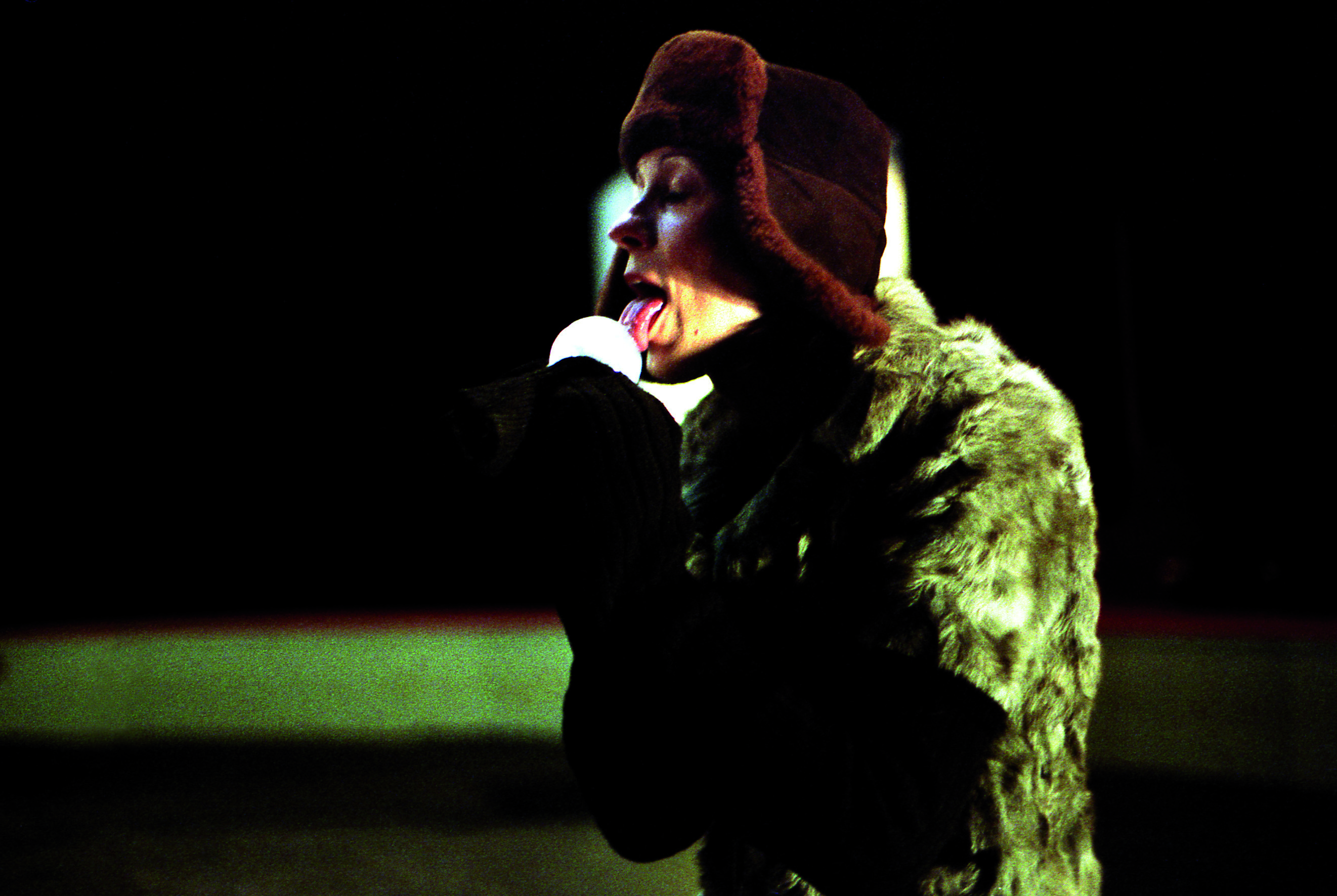 Des boules de glace, suspendues aux cintres, s’écrasent les unes après les autres au sol, en des éclats lourds et fantastiques. Phia Ménard slalome entre les obstacles, agile, gracieuse, ingénue. Elle joue, jongle avec le froid, fait corps avec les blocs, les manipule, les malmène, les caresse, inflige à son corps le glacé sur la peau. La matière est changeante, devient une excroissance du corps, prend son autonomie.
